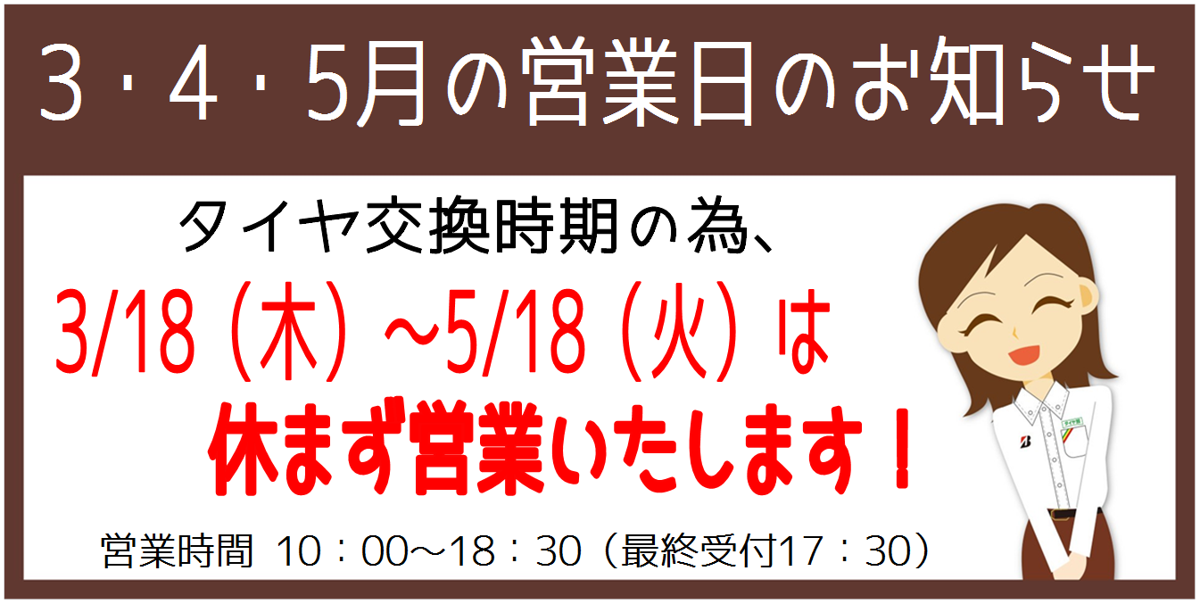 通常は毎週水曜は定休日なのですが、タイヤ交換時期の為、明日から定休日がなくなります!