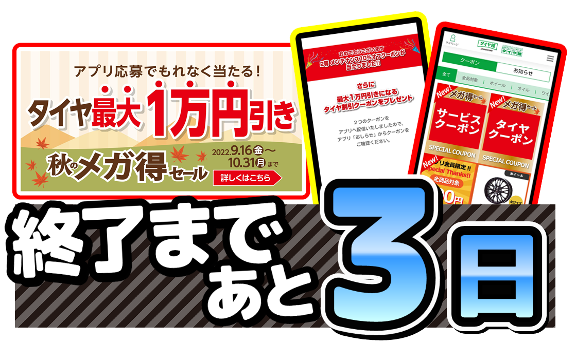 タイヤ最大1万円引きクーポン、ぜひご利用ください!