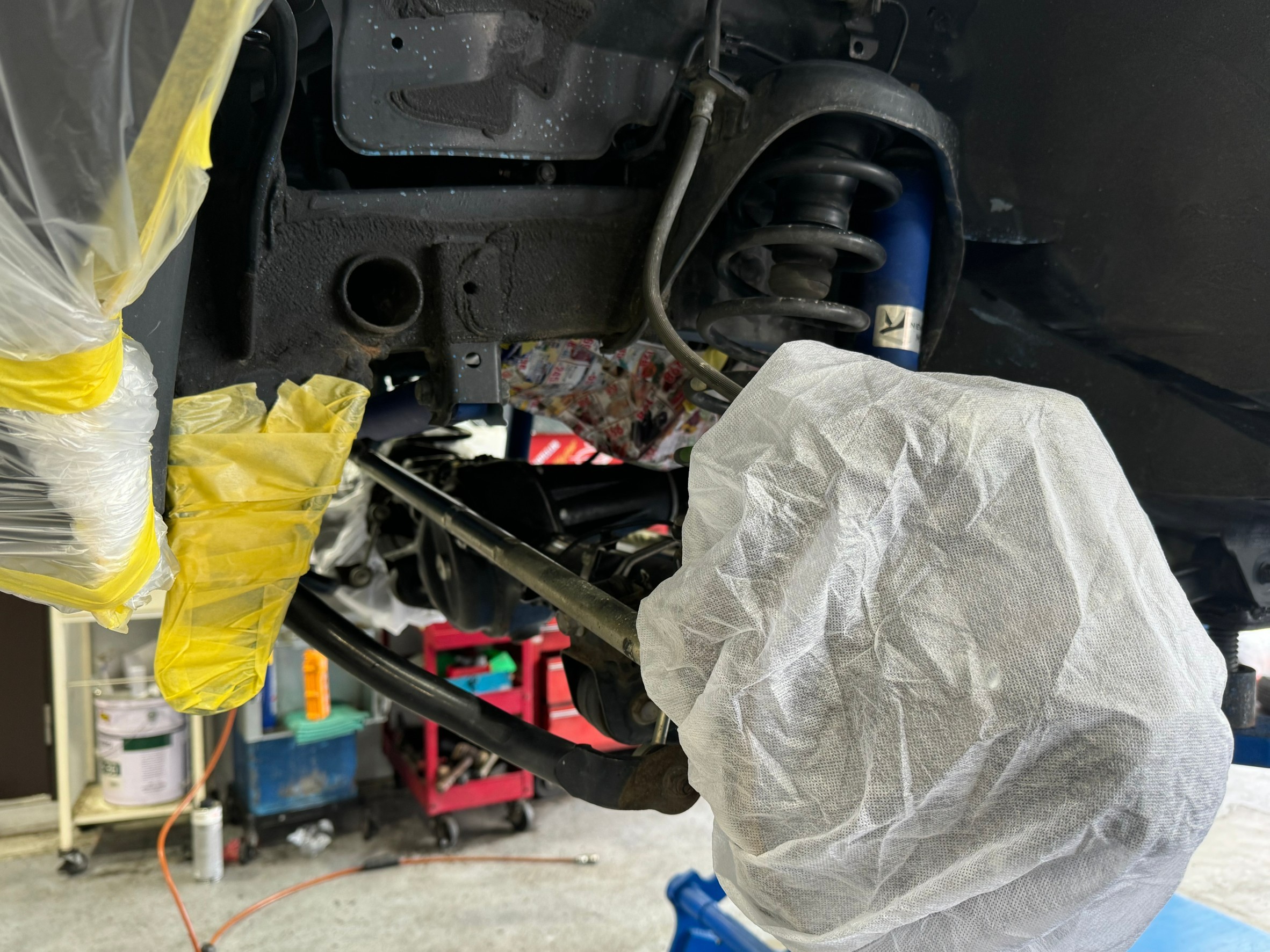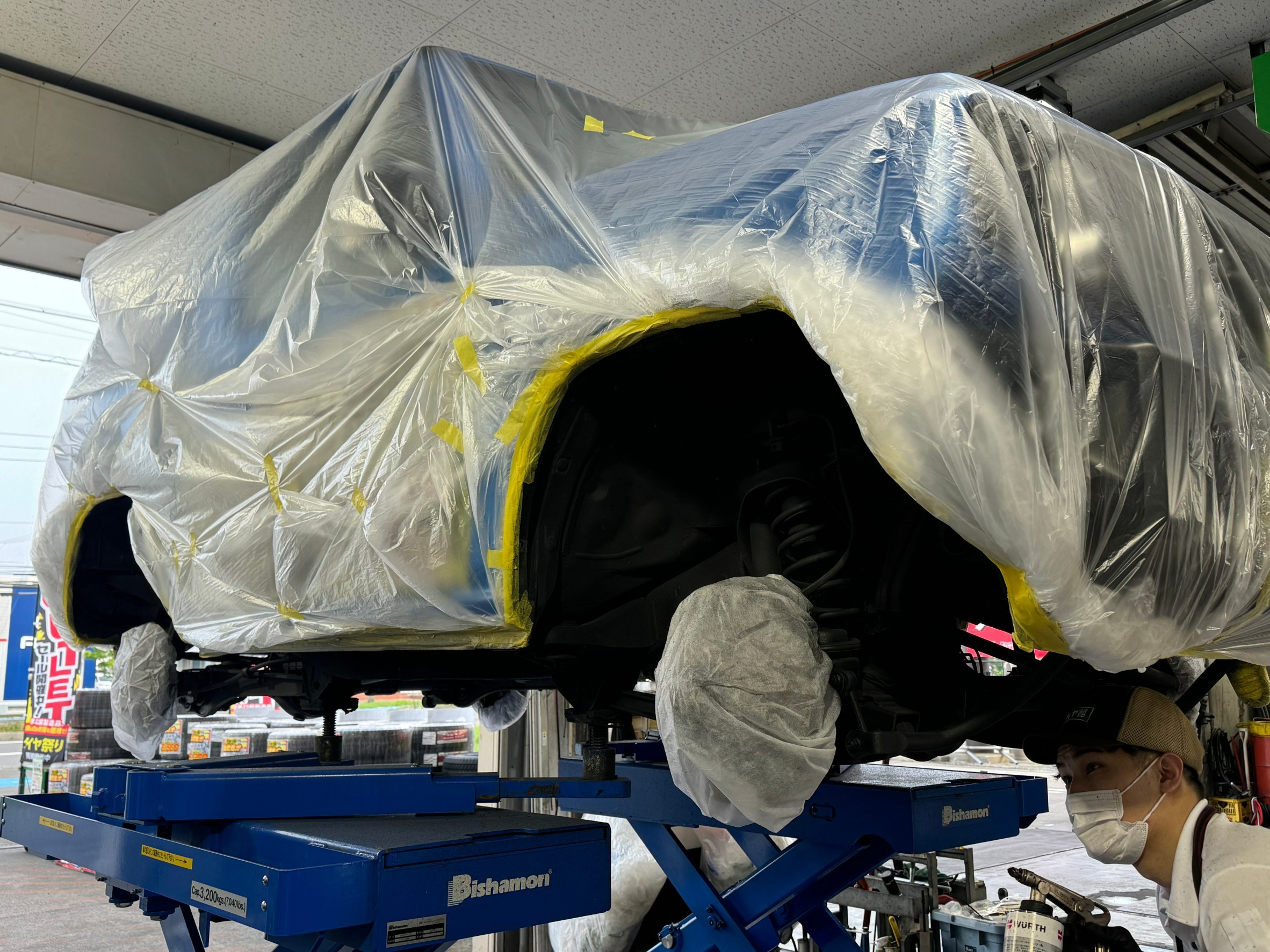 下廻りを洗浄後、お車のボディーをしっかり養生します。