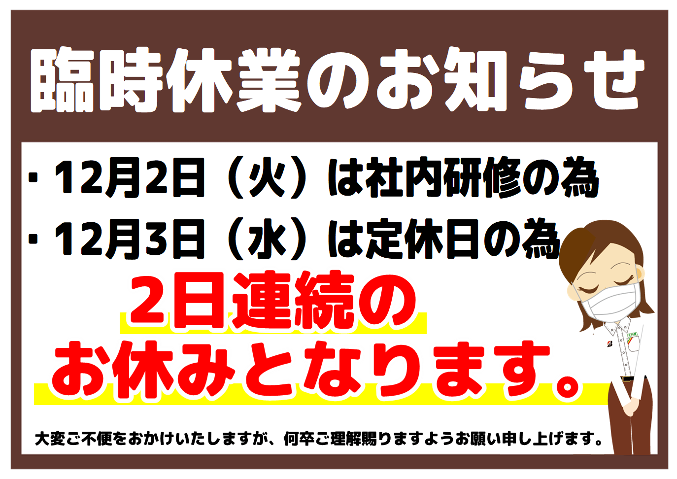 誠に勝手ながら、12月2日(火)は社内研修のため、3日(水)は定休日のため、営業をお休みさせていただきます。