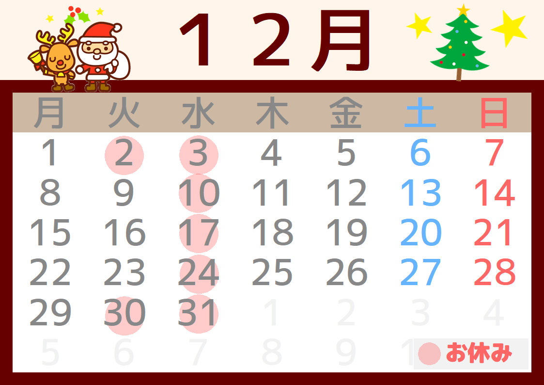 毎週水曜日と、2日(火)・30日(火)がお休みとなります。