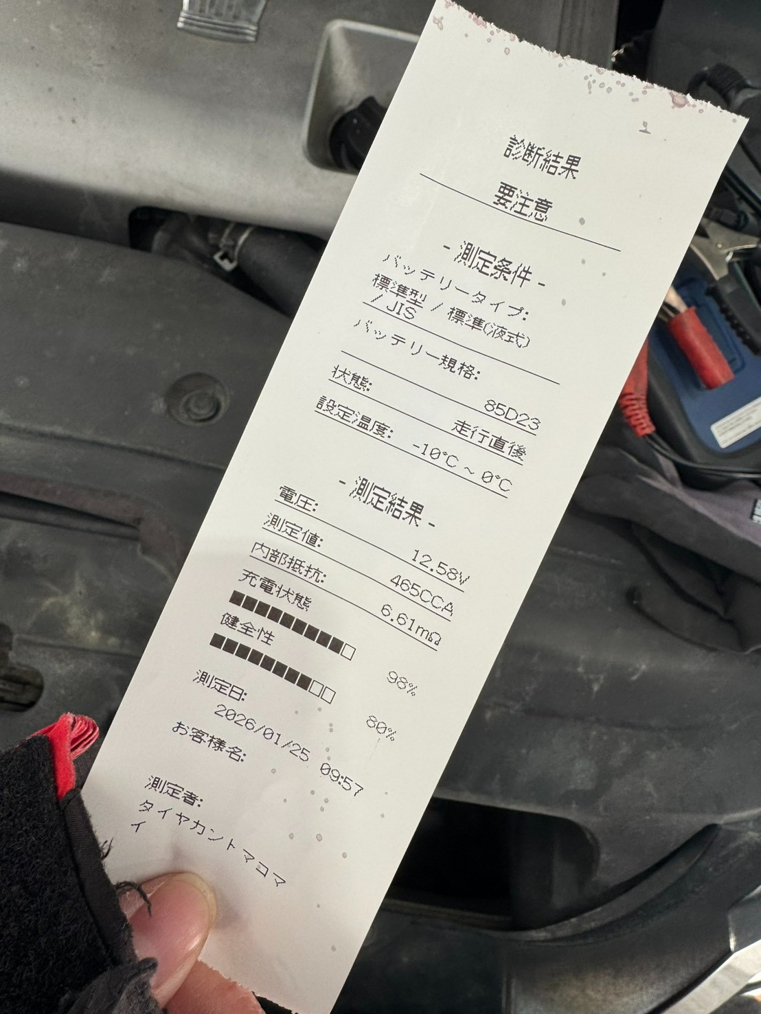 電圧が12.6V以下なことと、使用年数が3年以上なことから、要注意の診断結果となりました。