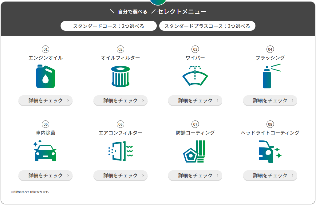 タイヤ交換2回分と、選べるメンテナンスメニューが2つついて、