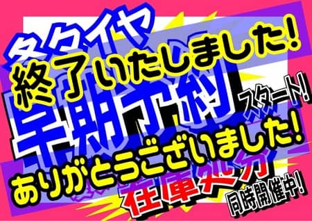 冬タイヤ早期予約 ”第一弾” 、終了!! ポスト 2016年8月31日 冬タイヤの早期予約【第一弾】は、本日で終了いたしました!たくさんのご来店、ご予約、ありがとうございました\(^o^)/今回来られなかったお客様…【第二弾】のセールにご期待ください☆決まり次第、お知らせいたします(^_^) 担当:あまの