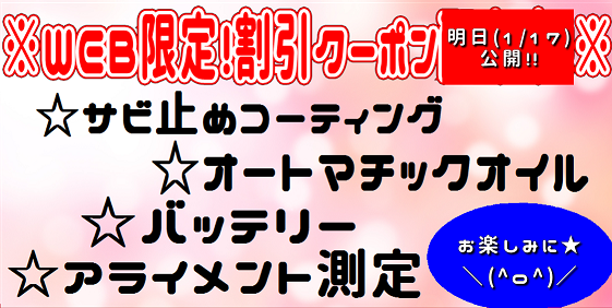 WEBをご覧の皆様だけに、とってもお得なお知らせです♪ ポスト 2017年1月16日 いつもタイヤ館苫小牧のホームページをご覧いただきありがとうございます! 日頃の感謝をこめて、WEB限定の割引クーポンをご用意いたしました(^_^) 明日(17日)から今月末までお使いいただけます。 17日の朝10時から、TOPページにクーポンが表示されますので、ぜひご覧くださいね★ 担当:あまの