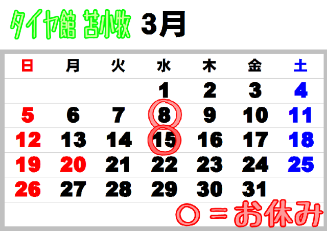というわけで、タイヤ館苫小牧の3月の休日カレンダーです。