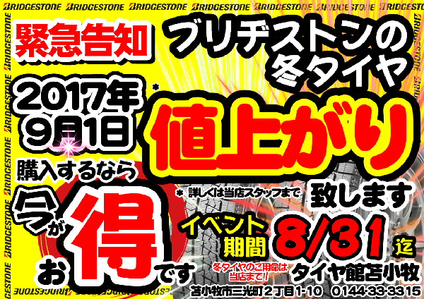 あと2週間で… ポスト 2017年8月17日 気付けばもう8月も半分を過ぎました。 あと2週間で… 【 冬タイヤ値上がり前イベント 】 が終了してしまいます(>_<) 来月からは、平均で6~8%ほど値上がりします! 買うなら絶対今ですよー(」゚ロ゚)」!!! 5~10分ほどでお見積りをお出しできます。 定休日(水曜)以外、毎日19時までみなさまのご来店をお待ちしております(^_^) 担当:あまの