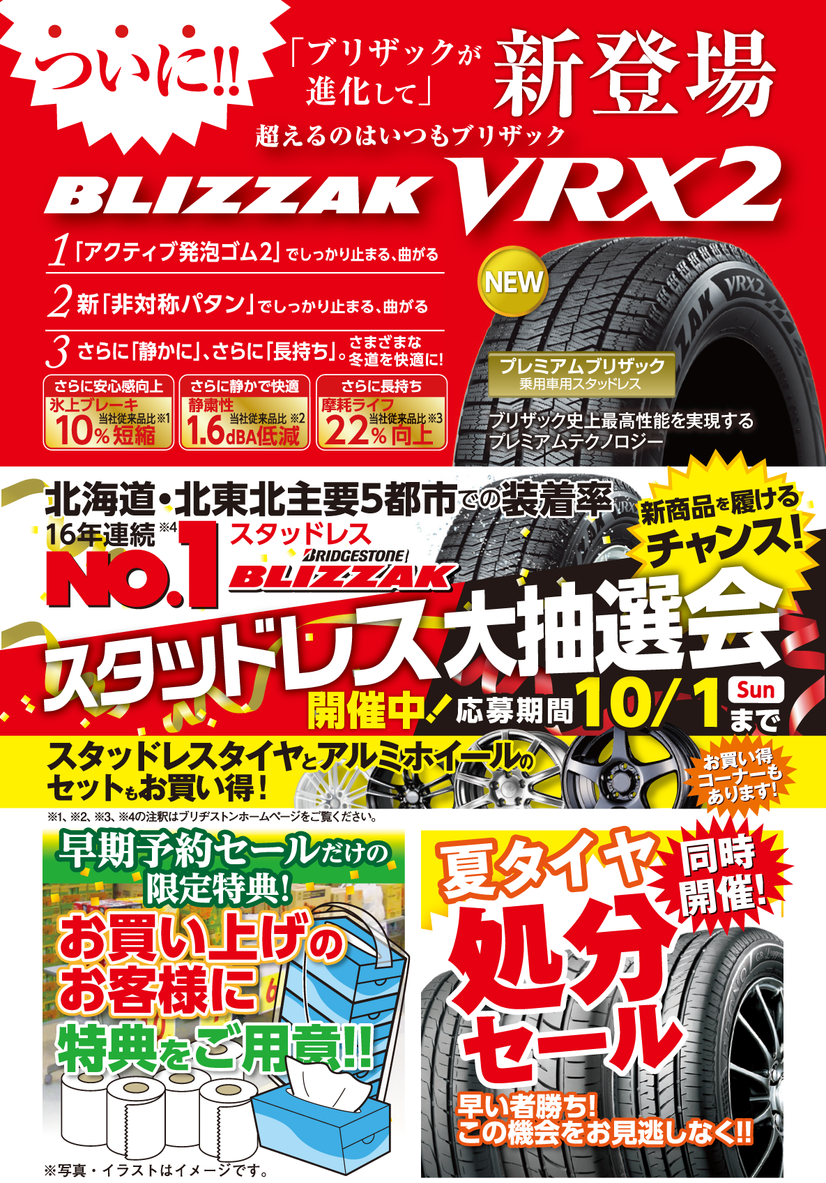 セールのお知らせです☆★ ポスト 2017年9月21日 今週末 《 9/23(土)・24(日) 》 の2日間、 お得なセールを開催いたします٩( 'ω' )و ★冬タイヤ早期予約 ★夏タイヤ在庫処分 ★スタッドレス大抽選会 ★ご成約で素敵なプレゼント などなど、とってもお得な2日間となっております(*^_^*) ご来店お待ちしております♪ ※ブリザックについて詳しくはブリヂストンホームページをご覧ください。 担当:あまの