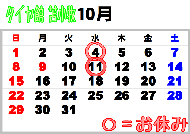 10月の定休日のお知らせ ポスト 2017年9月29日 毎週水曜日が定休日のタイヤ館苫小牧なのですが、 10月はタイヤ交換時期の為、 ★18日(水) ★25日(水) は営業いたします! 10月もお得なイベントを企画しておりますので、 タイヤ館苫小牧をどうぞよろしくお願いいたします❤ タイヤ交換・オイル交換などの作業は、電話予約がオススメです! TEL 0144-33-3315 までお問い合わせください。 担当:あまの