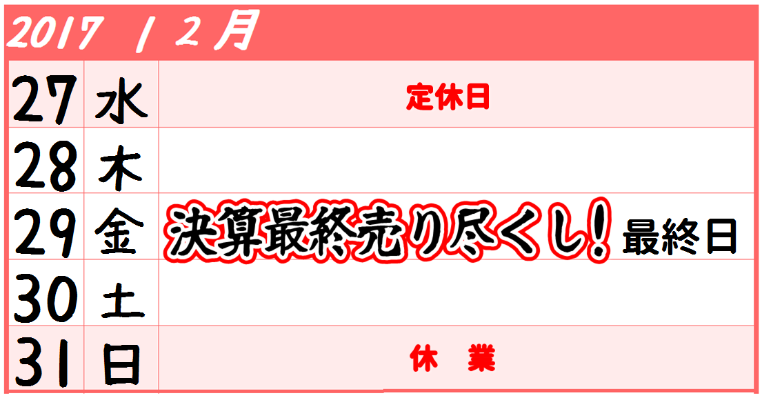 【 決算最終売り尽くし 】 は、29日(金)までとなっております。