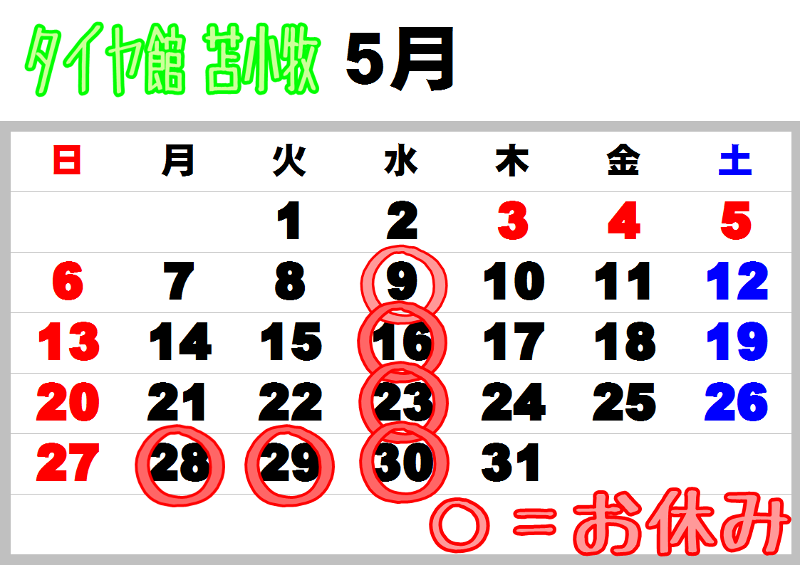 今週から、定休日が復活します ポスト 2018年5月8日 タイヤ交換で混雑する時期も終わりましたので、 明日9日より、毎週水曜日は定休日となります! そして、【 ショップからのお知らせ 】 にもありますとおり、 5月は店内改装の為、28日(月)・29日(火)を臨時休業とさせていただきます ご迷惑をおかけいたしますが、ご理解・ご協力のほど、よろしくお願いいたします! 担当:あまの