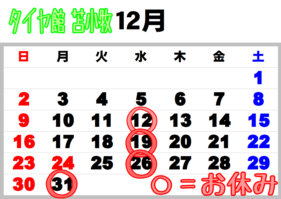明日は定休日です ポスト 2018年12月11日 タイヤ交換もだいぶ落ち着いてきましたので、明日から定休日が復活します! タイヤ館苫小牧は【 毎週水曜 】が定休日です。 今月は12日、19日、26日の水曜と、大晦日の31日がお休みとなります。 ご不便をおかけいたしますが、よろしくお願いいたします(>_<) 担当:あまの