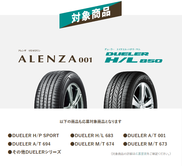 対象のタイヤは、ALENZAとDUELERシリーズ!