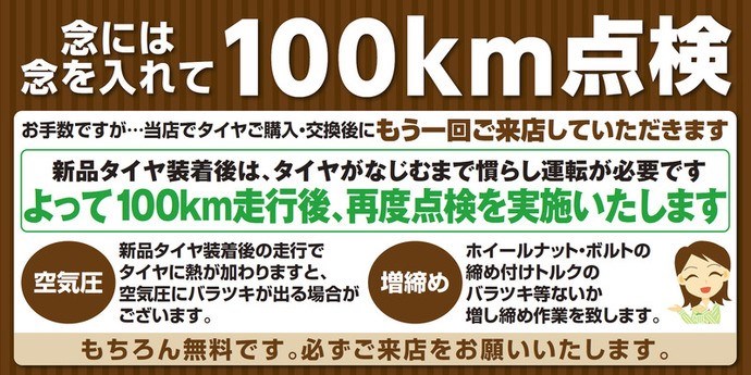当店でタイヤ交換されたお客様には【 1週間後か100Km走行後 】 に 【 空気圧の変化とナットの緩み 】 の 《 確認の為の再来店 》 をお願いしています。