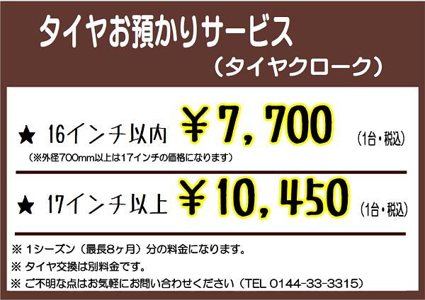 タイヤお預かりサービス(タイヤクローク) ポスト ・タイヤの保管場所がない ・持ち運びが大変 ・盗難が心配 そんな時は当店にお預けください! 専用の倉庫で大切に保管いたします! 詳細は画像をご覧ください。 画像はクリックで拡大できます。 関連情報もあわせてご覧ください 詳しくはこちら 詳しくはこちら カテゴリ:商品情報 その他商品・サービス