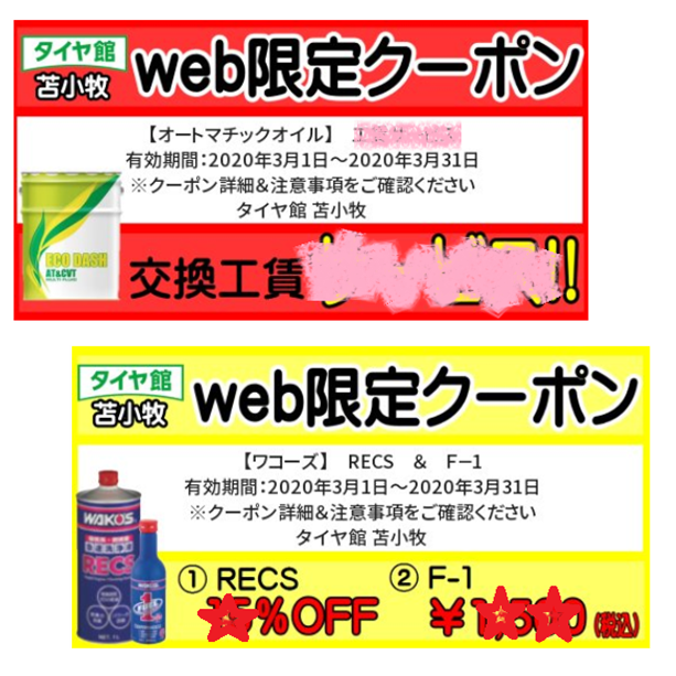 3月はオートマチックオイル(ATF)と、ワコーズのRECS・F-1(フューエルワン)のクーポンが登場(*゚ー゚*)
