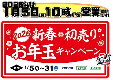 旧年中はコクピット・タイヤ館をご利用いただき、誠にありがとうございました。 本年もお客様の安全・安心なカーライフの為、一層努力してまいりますので、 引き続き宜しくお願い申し上げます。 いつもコクピット・タイヤ館をご愛顧いただいているアプリ会員様限定で 新春初売りお年玉キャンペーン...