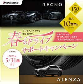 記事一覧 春のドライブサポートキャンペーン実施中✿ この春タイヤ購入でレグノ・アレンザをご検討中の方へ この機会にいかがでしょうか? 春のドライブサポートキャンペーン 5/31まで 期間中指定のタイヤ4本ご購入いただき イベントページでご応募いただくと抽選でえらべるpayをプレゼントします。 ぜひ!ご利用ください。 応募期間 2026年4月9日... 2026年4月28日 ポスト