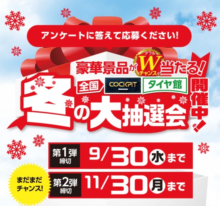 冬の大抽選会開催中! ポスト 2020年11月22日 こんにちは(^^)/ アンケートに答えて応募!冬の大抽選会!! 第2弾締切までのこり約1週間となりました!! みなさん、応募しましたか? 11月30日(月)までです!! まだの方は応募してみてください(^^)/ 冬の大抽選会 ↑ コチラをクリックすると応募サイトに移動できます。 担当:脇本