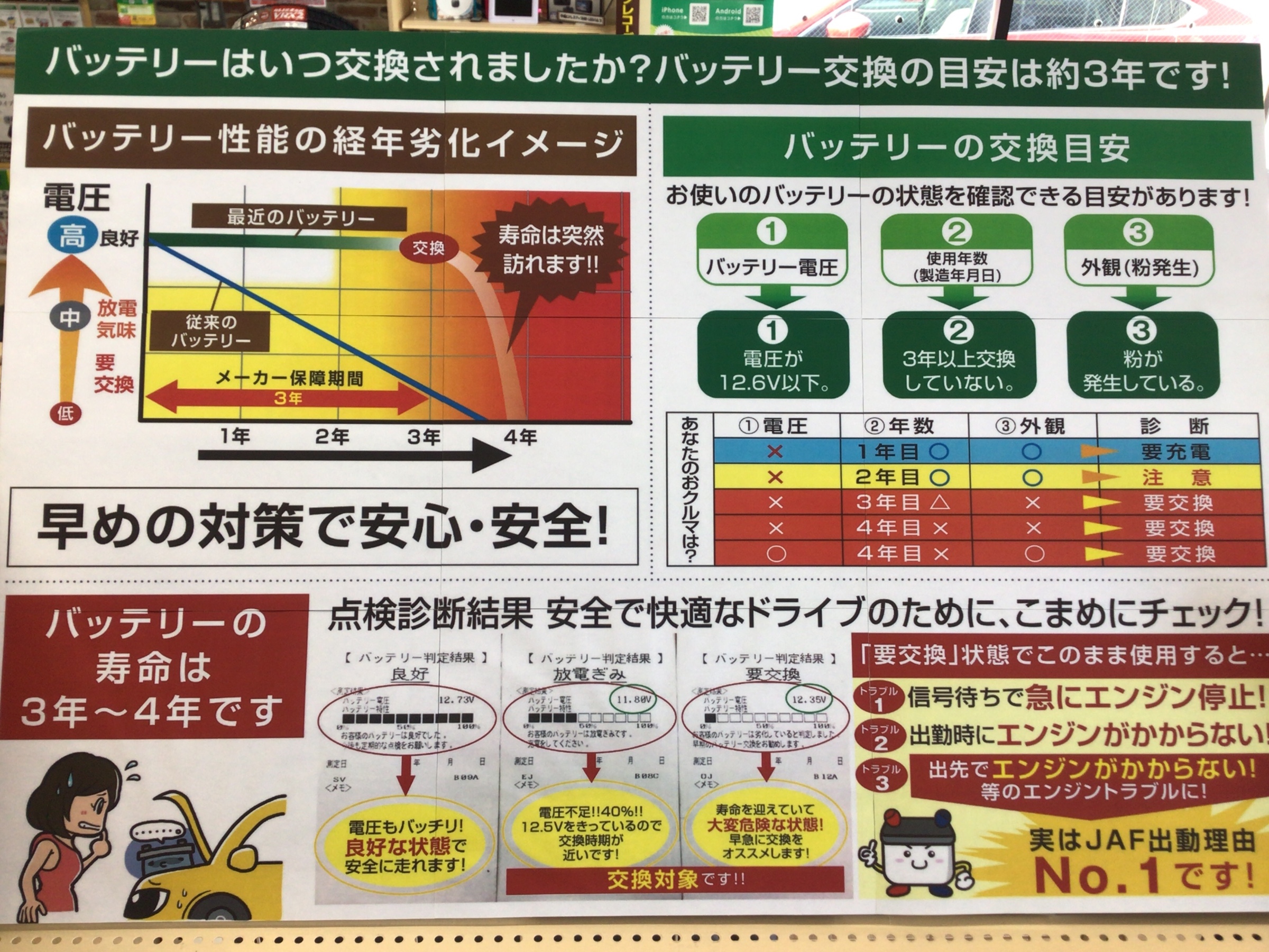 今年に入りまだ日数も経っていないのですが、なんと、、、5台のお客様がエンジンのかかりが悪いなどバッテリーが上がってしまったなどで来店されてます。