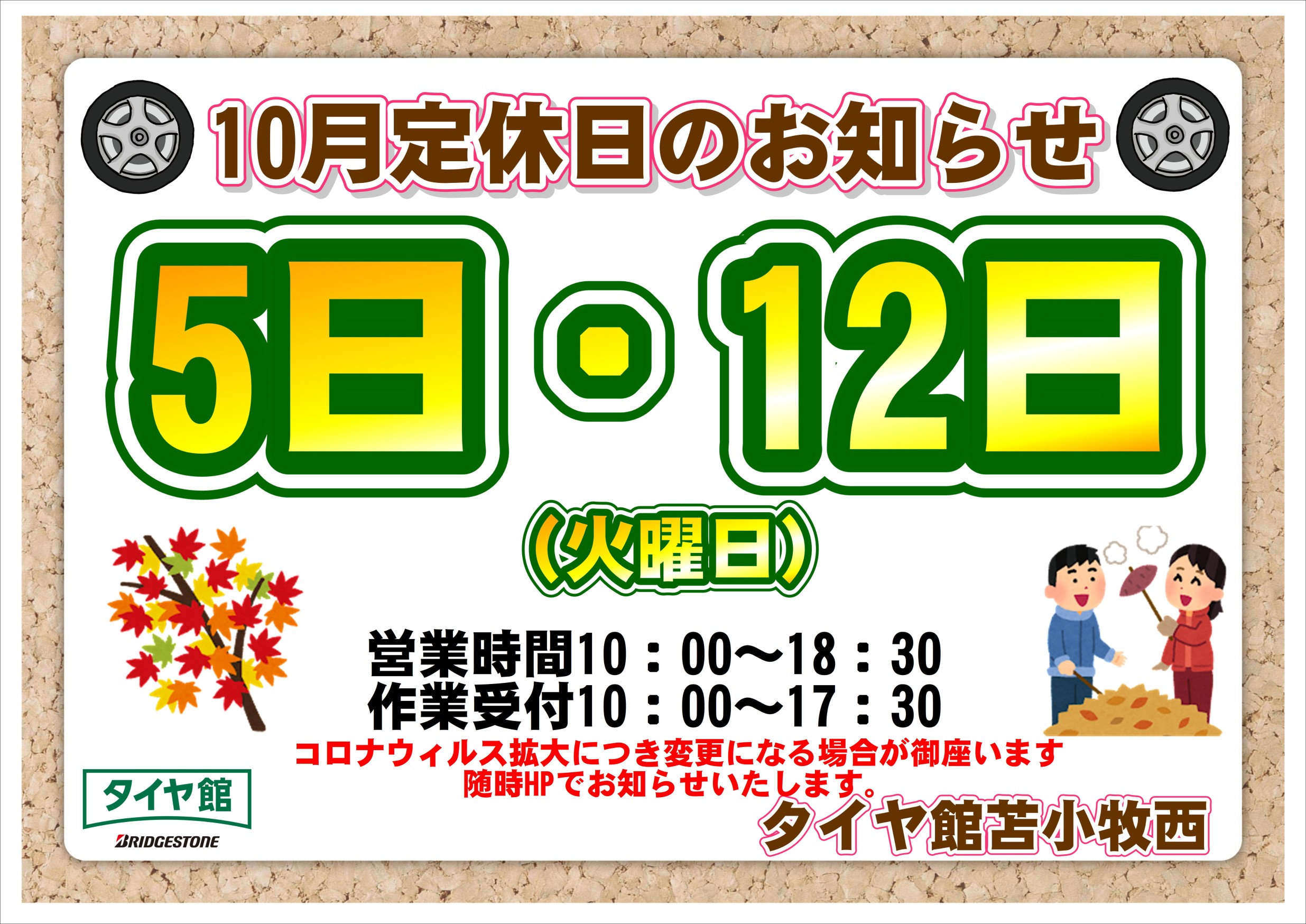 定休日のお知らせ ポスト 2021年9月30日 いつもタイヤ館苫小牧西店をご利用いただき 誠にありがとうございます。 毎週火曜日は定休日でございます。 10/19・10/26は火曜日ですが営業日ですので お間違えの無いようお願いいたします。 尚、10月中の他営業日は通常通り 10:00~18:30 の営業時間でございます。 たくさんのご来店を心よりお待ちしております。 スタッフ一同 カテゴリ:お知らせ