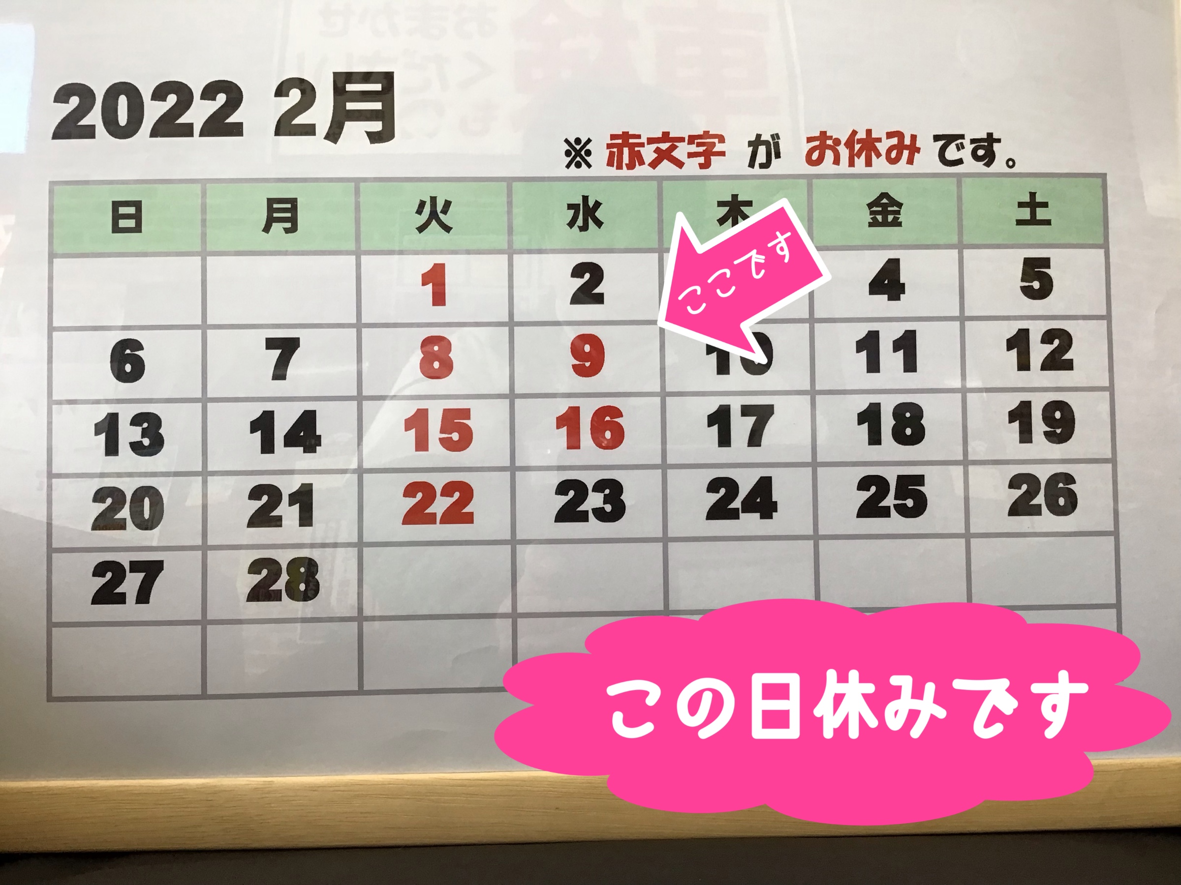 2月の定休日ですが、毎週火曜日の他に2/9と2/16にお休みを頂きます。