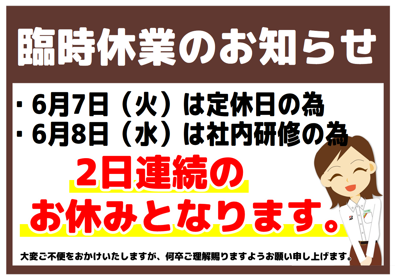 6/7 6/8 は店舗はお休みとなっております! ポスト 2022年6月6日 こんにちは! 木村 卓と申します! 6/7 6/8は店舗はお休みとなっております! 皆様にご迷惑をお掛けしますがお願い致します。 6/9は通常営業しております!お待ちしております! 店舗お休みカレンダー こちらを合わせてチェックお願い致します! 担当:木村 卓
