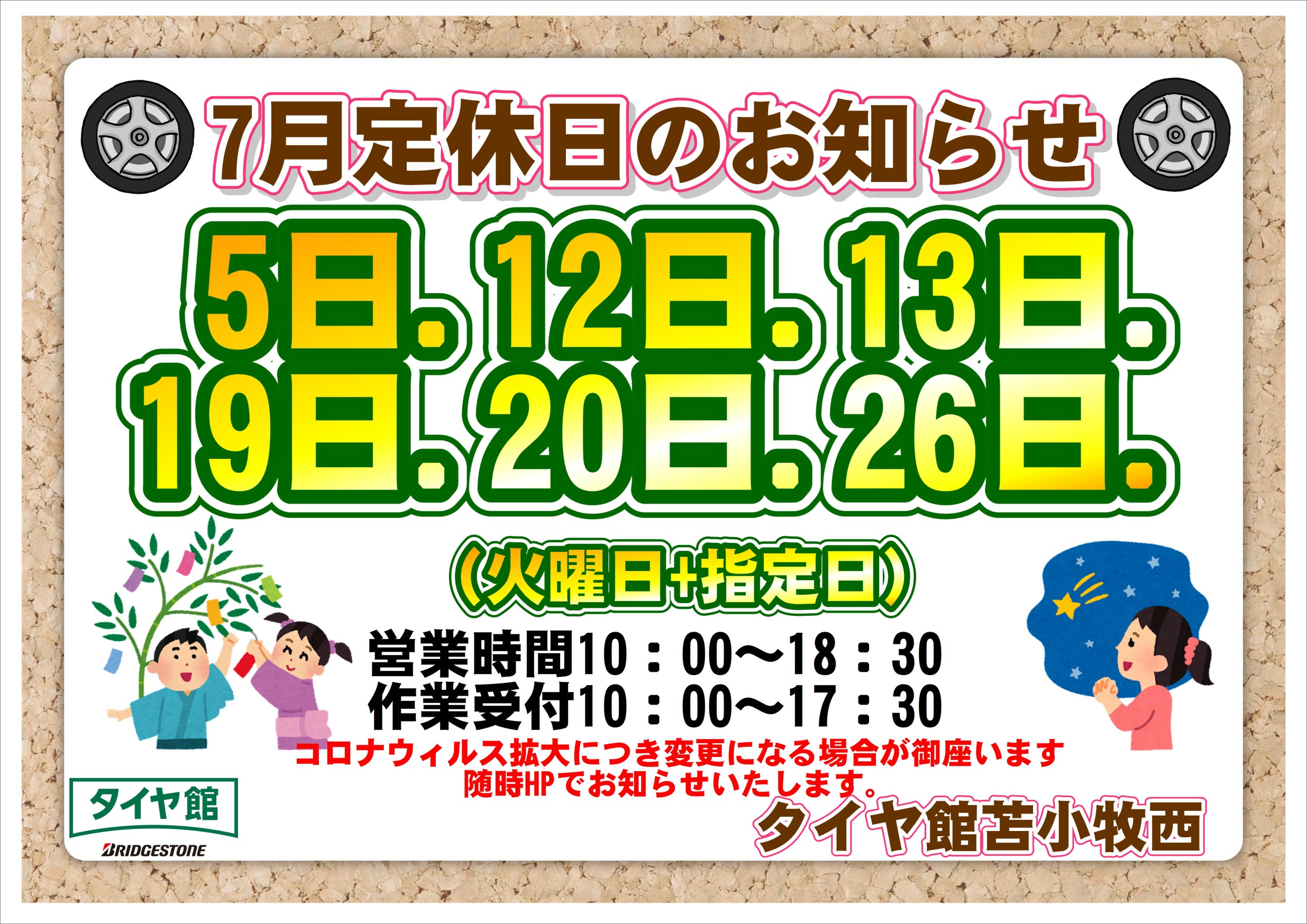 7月定休日のお知らせ ポスト 2022年6月23日 いつもタイヤ館苫小牧西店をご利用いただき 誠にありがとうございます。 2022年7月の定休日をご案内いたします。 7月 5日(火) 定休日 7月12日(火) 定休日 7月13日(水) 定休日 7月19日(火) 定休日 7月20日(水) 定休日 7月26日(火) 定休日 毎週火曜の定休日に加えて、 【7月13日(水)・7月20日(水)】が定休日です。 ご来店の際はお間違えの無いよう たくさんのご来店を心よりお待ちしております。 スタッフ一同 カテゴリ:お知らせ