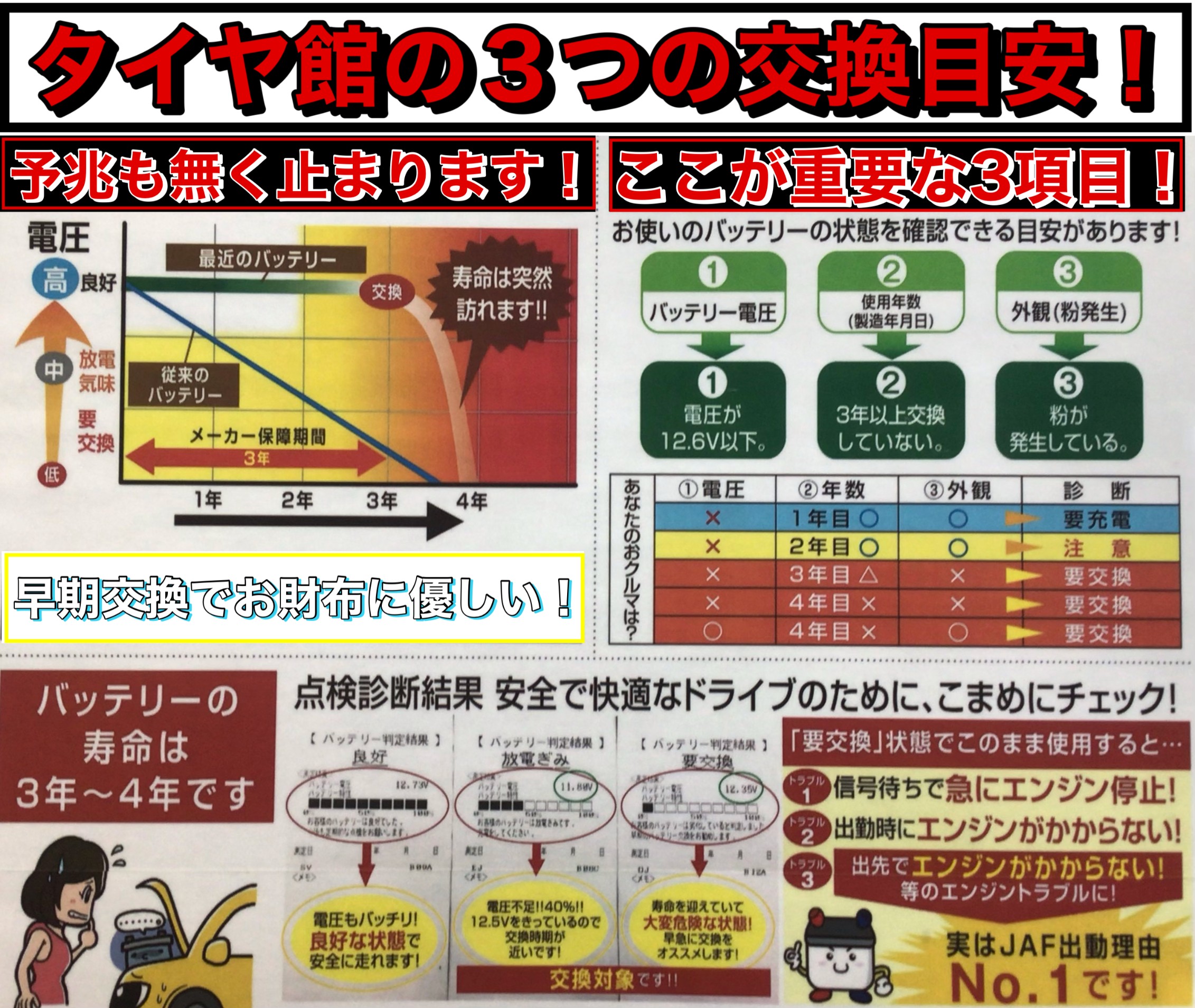 夏もバッテリーに注意! ポスト 2022年7月8日 こんにちは! 木村卓と申します! 本日は!夏のバッテリーも要注意!交換の基準についてです! タイヤ館オススメの交換ポイントになります! 現在セールも開催中!バッテリーもお得になります! セール詳細はこれをクリック! 無料点検も行ってますので!お待ちしております! 担当:木村 卓