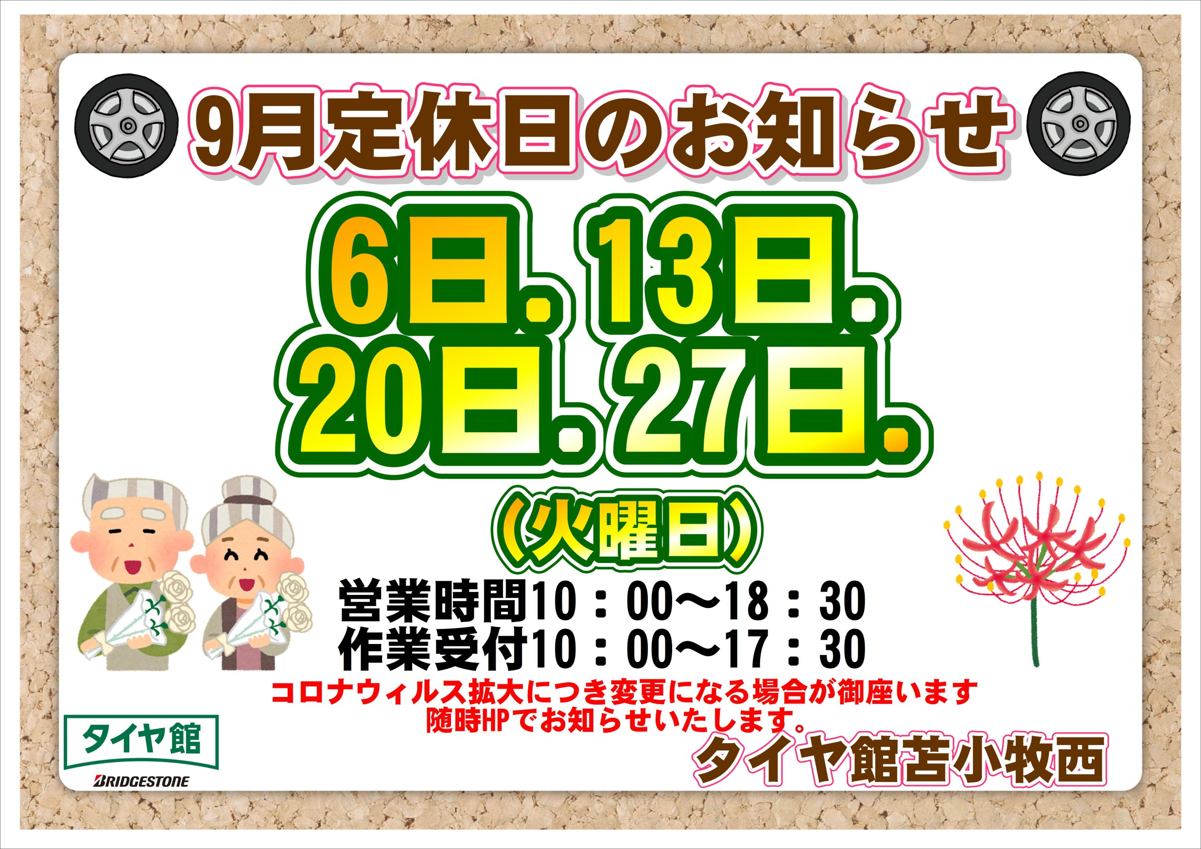 9月定休日のお知らせ ポスト 2022年8月26日 いつもタイヤ館苫小牧西店をご利用いただき 誠にありがとうございます。 2022年9月の定休日をご案内いたします。 9月 6日(火) 定休日 9月13日(火) 定休日 9月20日(火) 定休日 9月27日(火) 定休日 ご来店の際はお間違えの無いよう たくさんのご来店を心よりお待ちしております。 スタッフ一同 カテゴリ:お知らせ