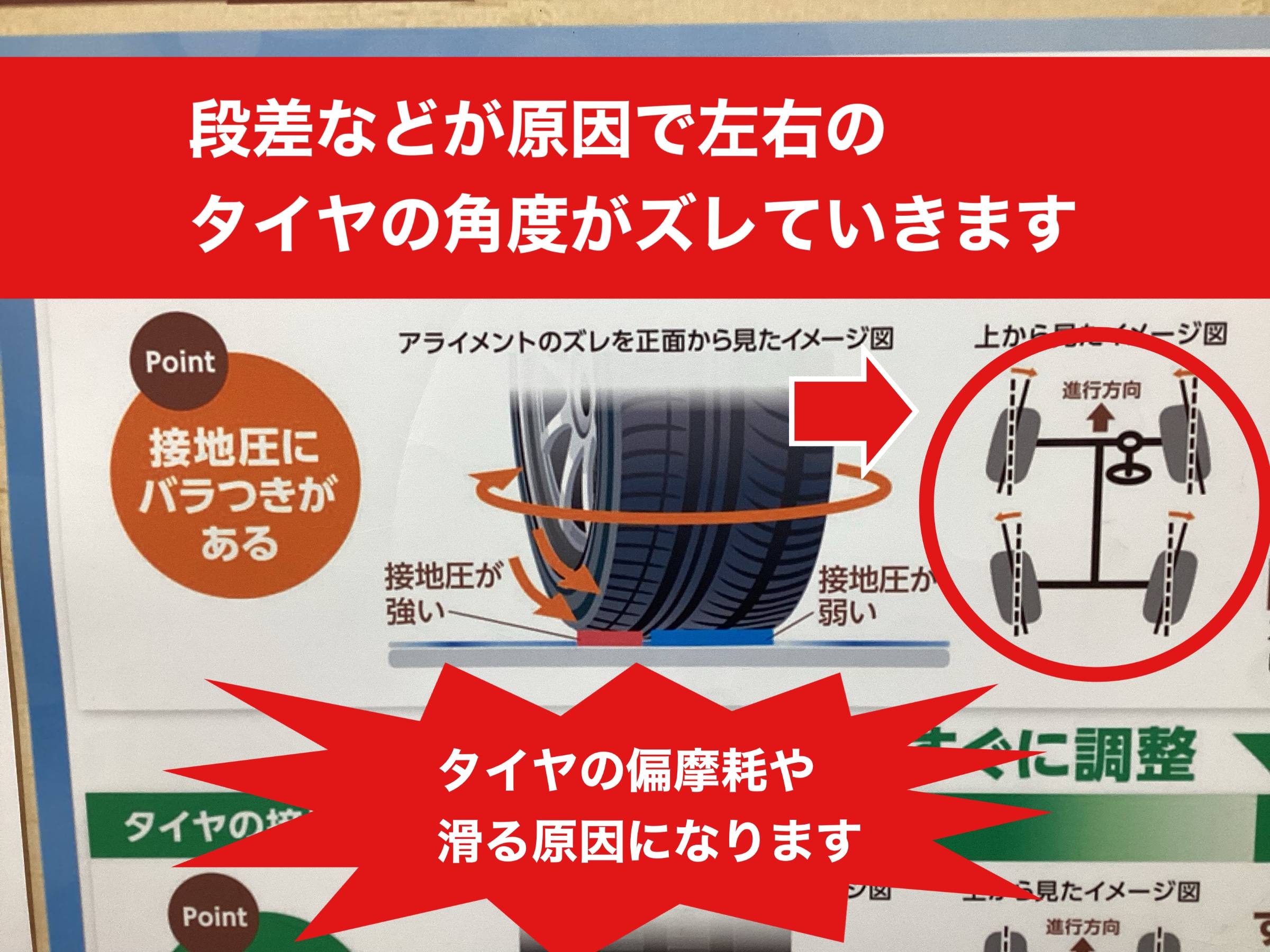 アライメントがズレていると新品タイヤでも滑りやすくなります!冬のアライメントは重要です。