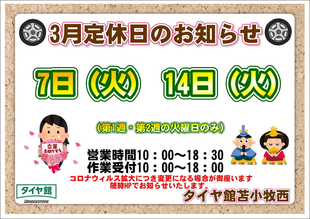 3月定休日のお知らせ ポスト 2023年2月24日 いつもタイヤ館苫小牧西店をご利用いただき 誠にありがとうございます。 2023年3月の定休日をご案内いたします。 3月 7日(火) 定休日 3月 14日(火) 定休日 第3週目(3月21日火曜日)以降は営業日でございます。 ご来店の際はお間違えの無いよう たくさんのご来店を心よりお待ちしております。 スタッフ一同 カテゴリ:お知らせ