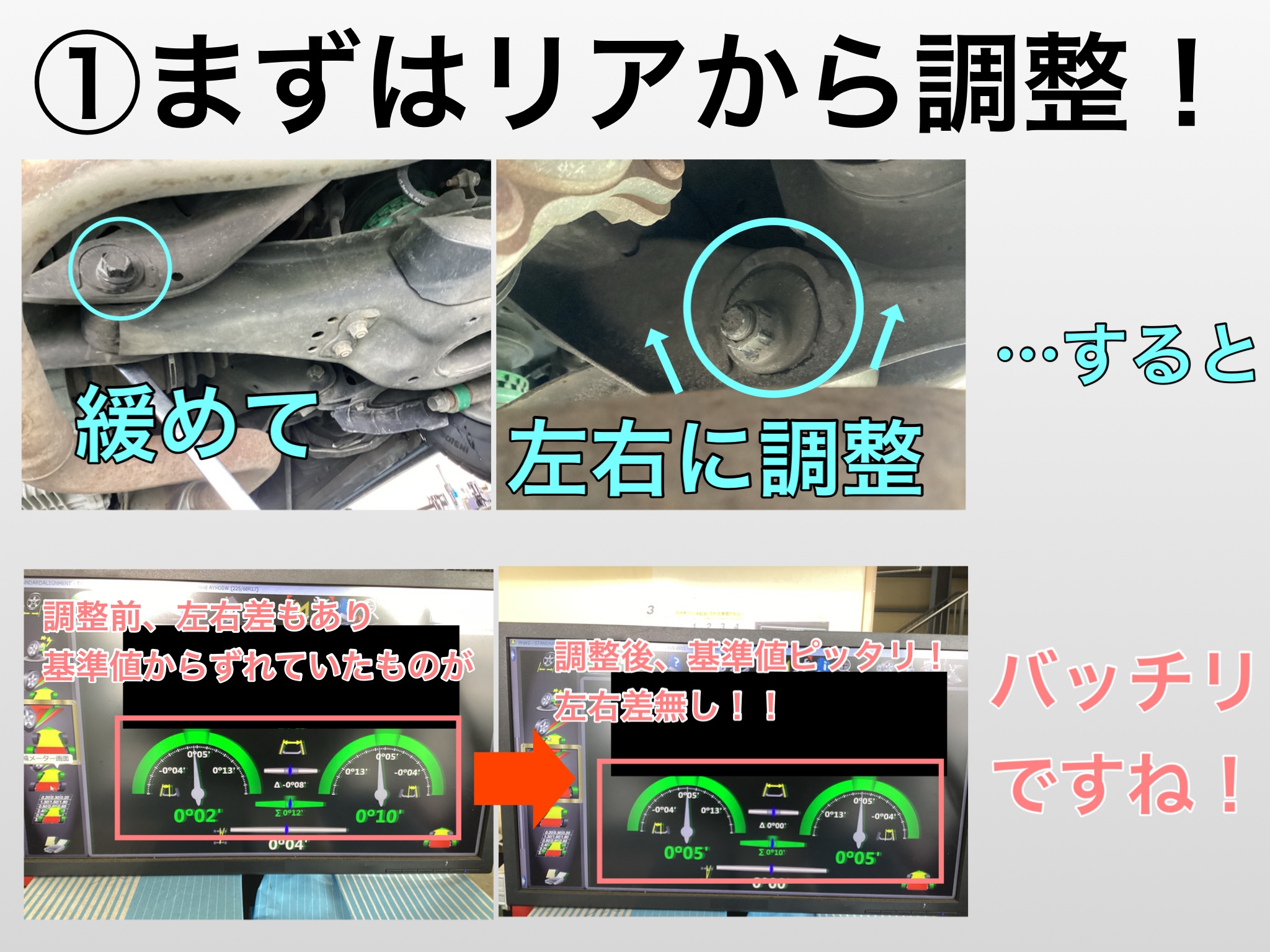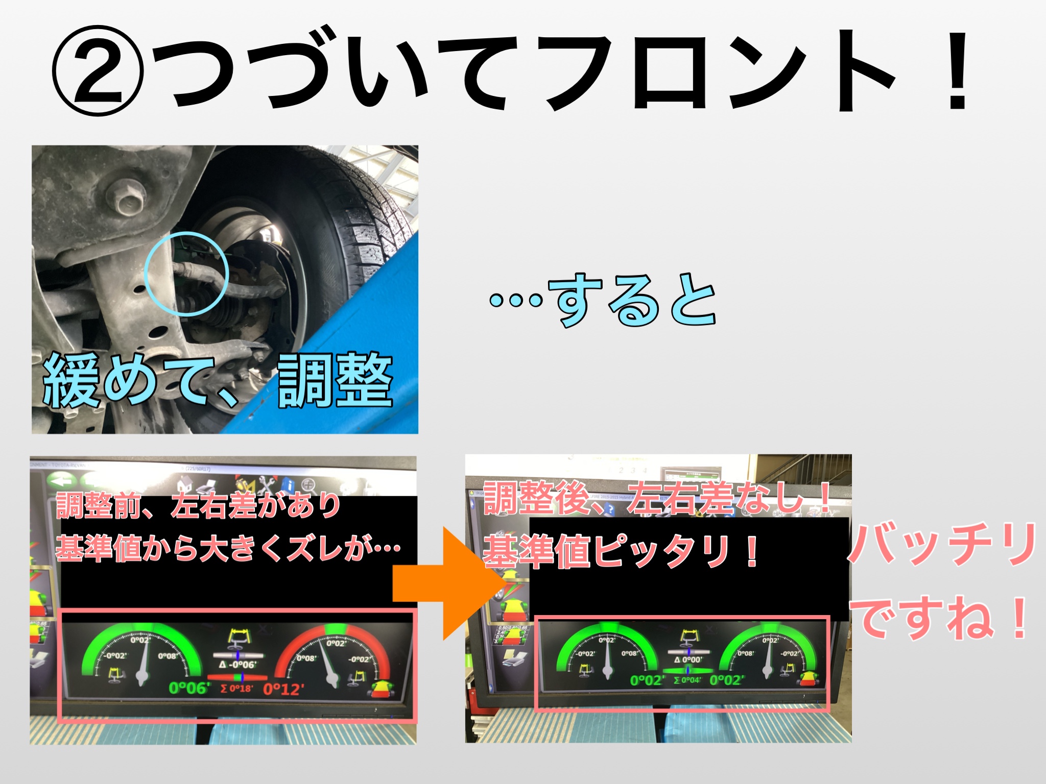 今回はタイヤ装着後のアライメント作業を