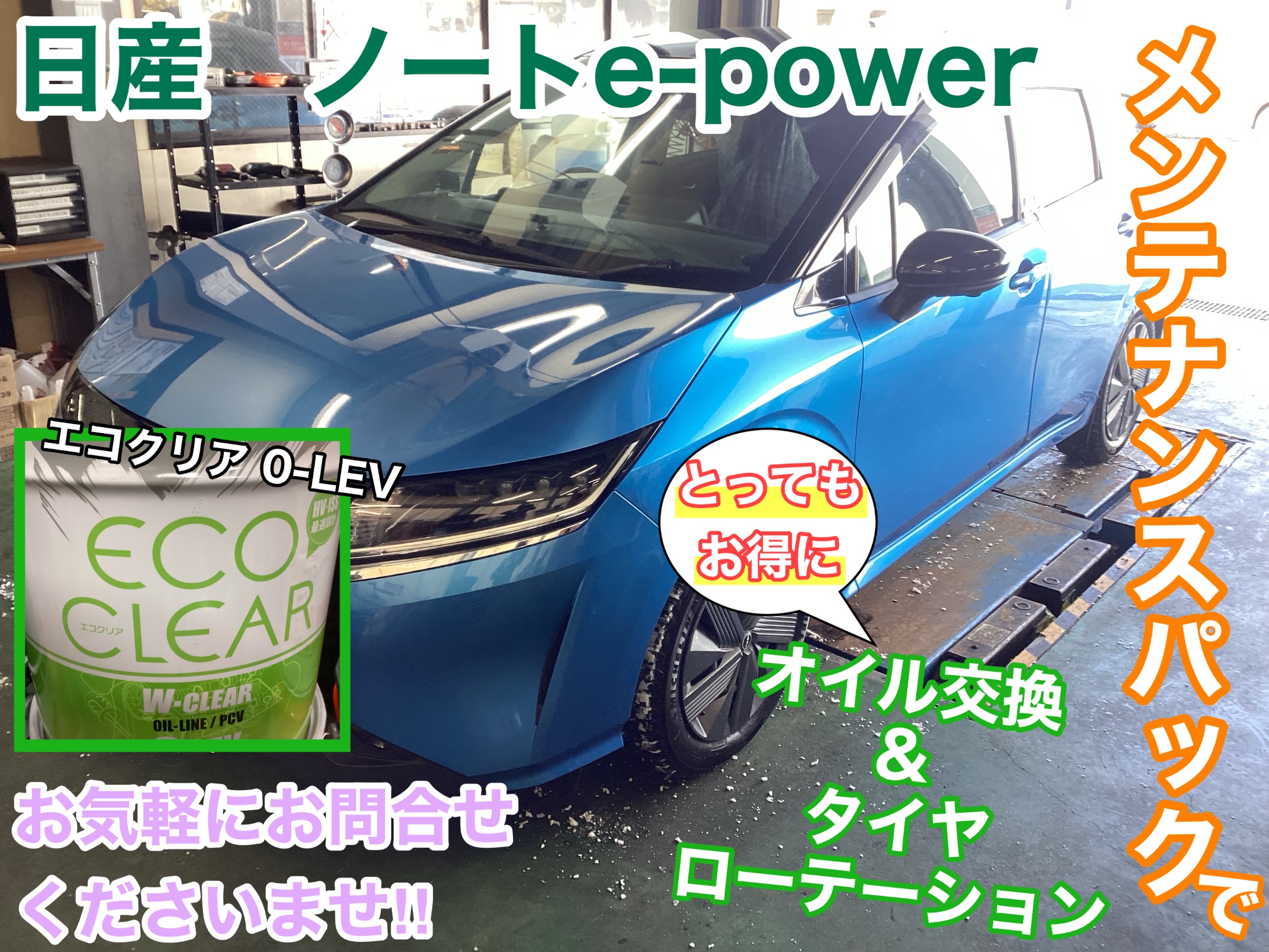 日産 ノートe-powerにお得なメンテナンスパックでオイル交換&ローテーション施行!〜オイル編〜