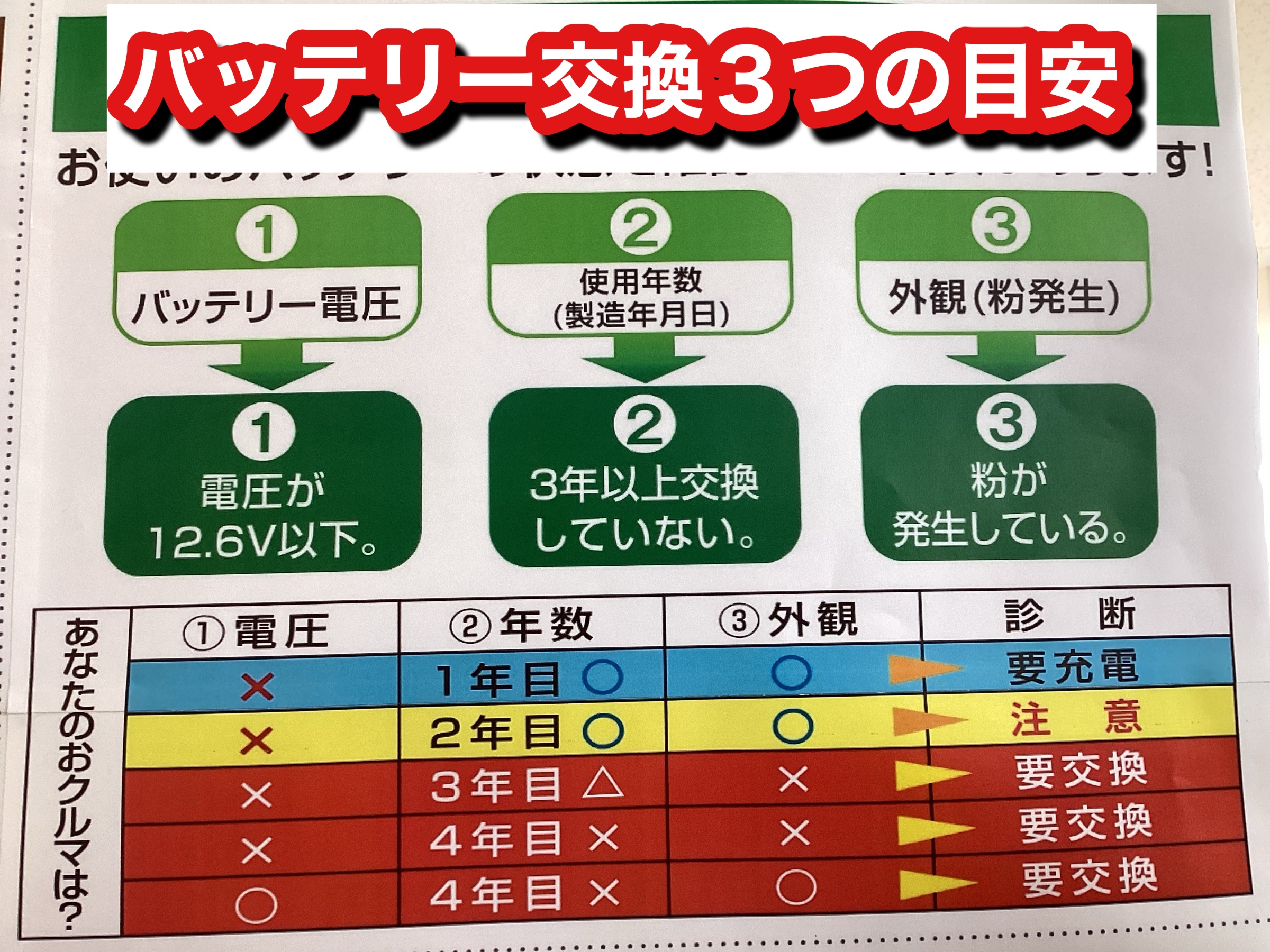 この3つがバッテリー交換の目安となります。