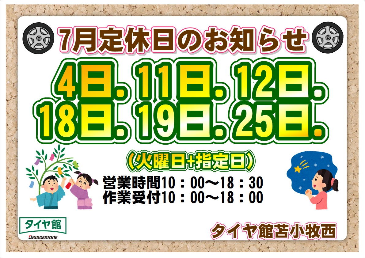 7月定休日のお知らせ ポスト 2023年6月24日 いつもタイヤ館苫小牧西店をご利用いただき 誠にありがとうございます。 2023年7月の定休日をご案内いたします。 7月 4日(火) 定休日 7月 11日(火) 定休日 7月 12日(水) 定休日 7月 18日(火) 定休日 7月 19日(水) 定休日 7月 25日(火) 定休日 ご来店の際はお間違えの無いよう たくさんのご来店を心よりお待ちしております。 スタッフ一同 カテゴリ:お知らせ