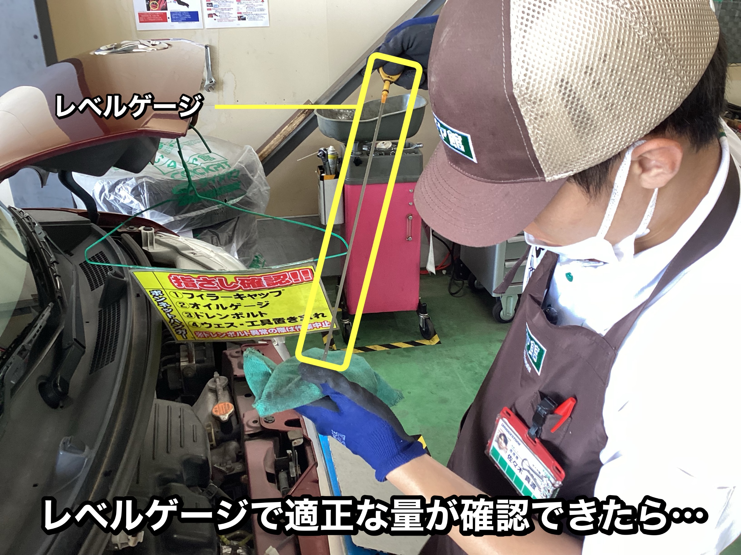 レベルゲージでオイル量を確認後、