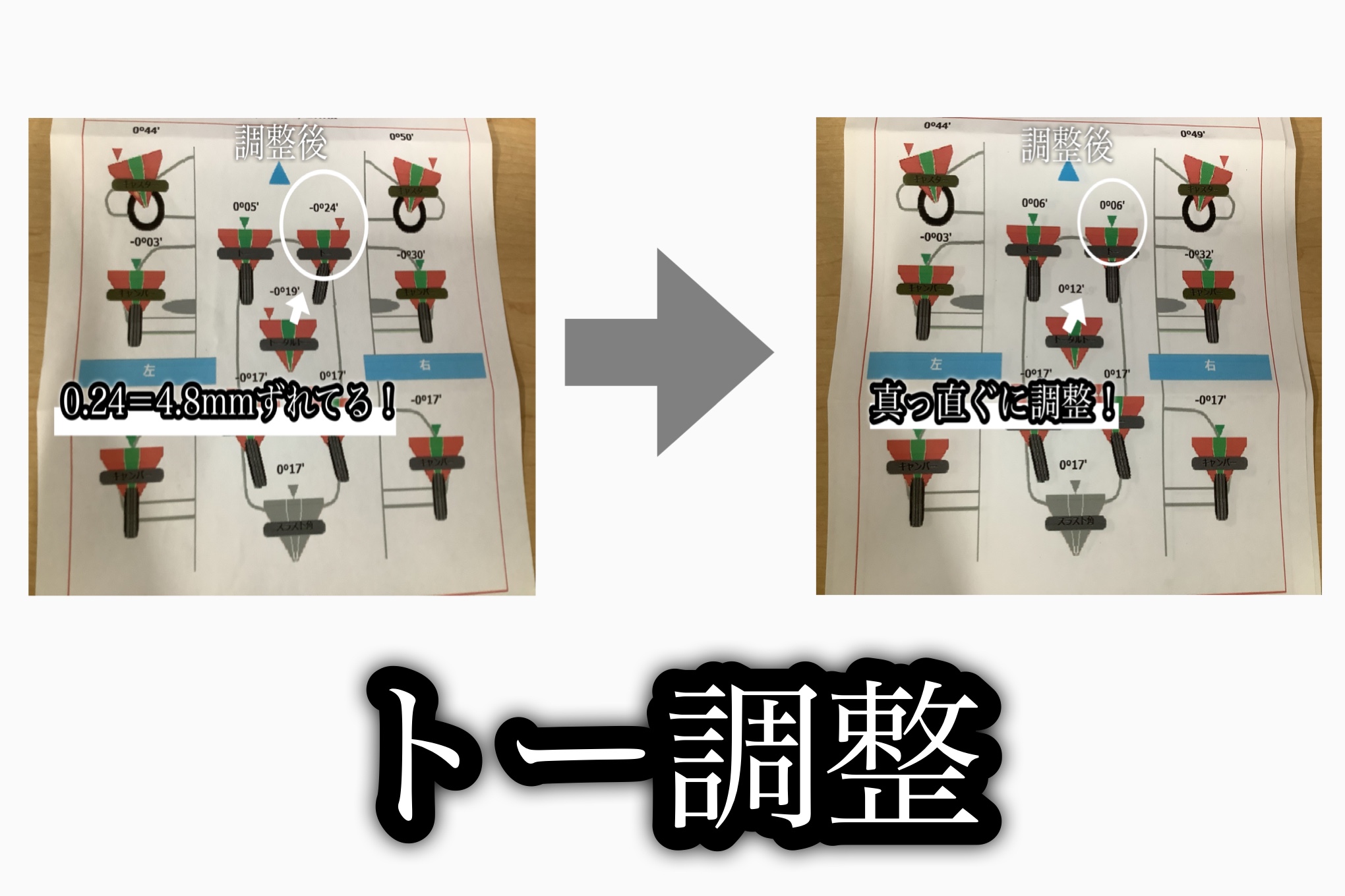 トー角とは、車を上から見下ろした時のタイヤの先端の向きのことです!