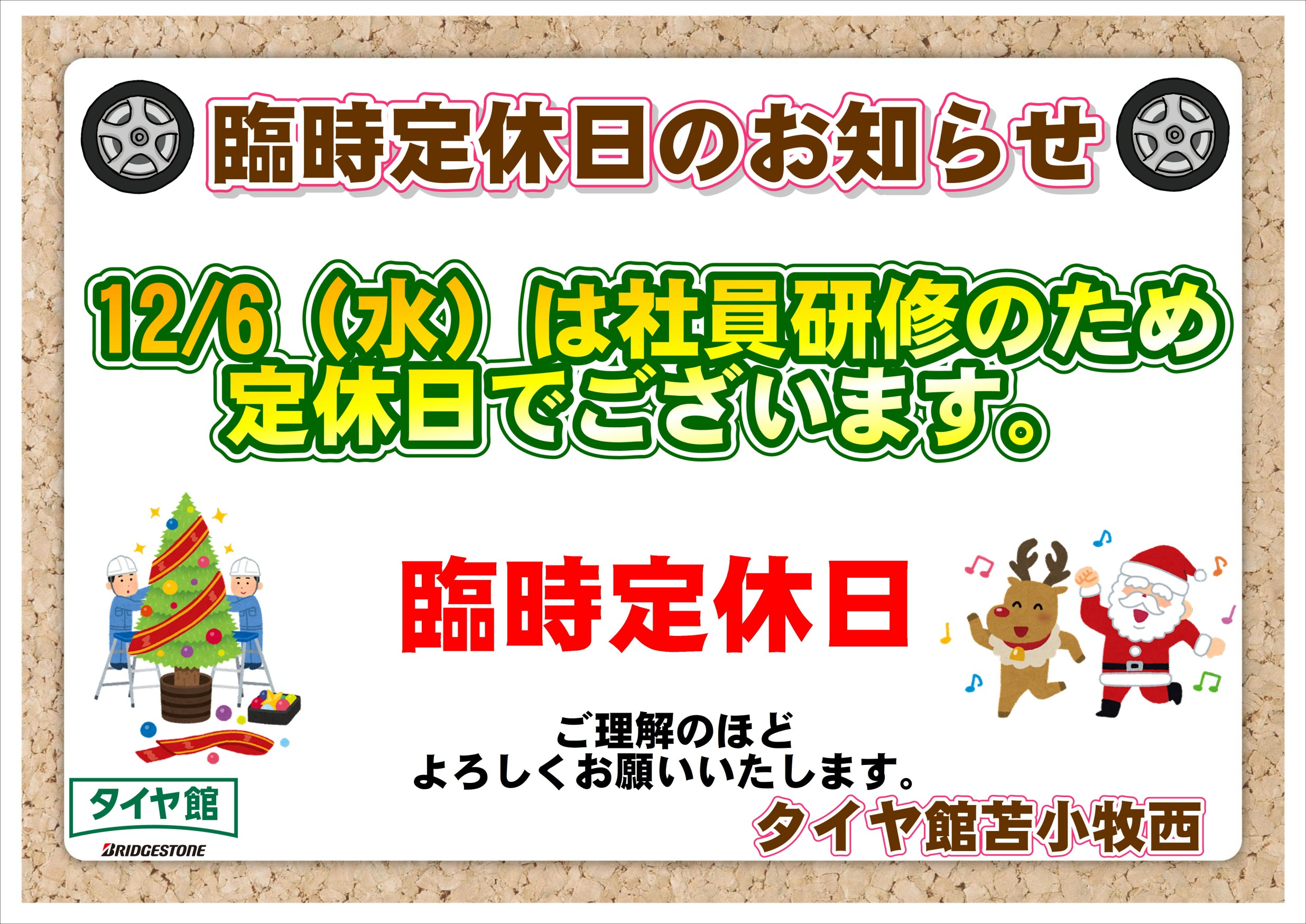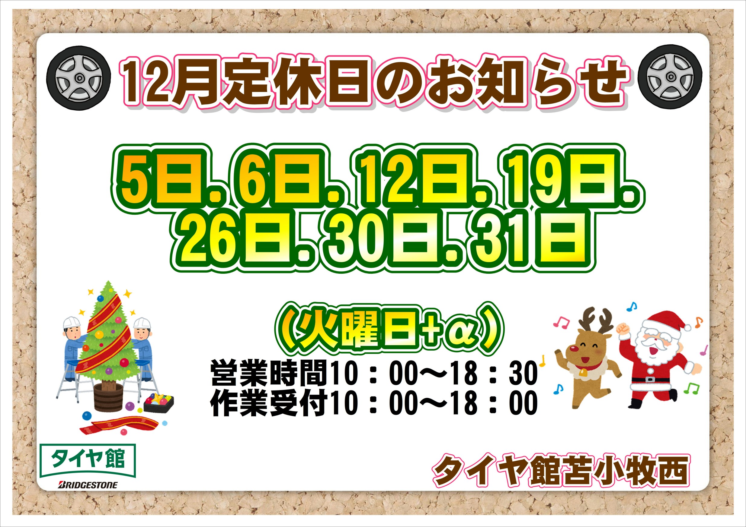12月定休日のお知らせ ポスト 2023年11月29日 いつもタイヤ館苫小牧西店をご利用いただき 誠にありがとうございます。 2023年12月の定休日をご案内いたします。 12月 5日(火) 定休日 12月 6日(水) 臨時定休日 12月12日(火) 定休日 12月19日(火) 定休日 12月26日(火) 定休日 12月30日(土) 年末年始 定休日 12月31日(日) 年末年始 定休日 毎週火曜日以外にも定休日がありますので ご来店の際はお間違えの無いようお願いいたします。 たくさんのご来店を心よりお待ちしております。 スタッフ一同 カテゴリ:お知らせ