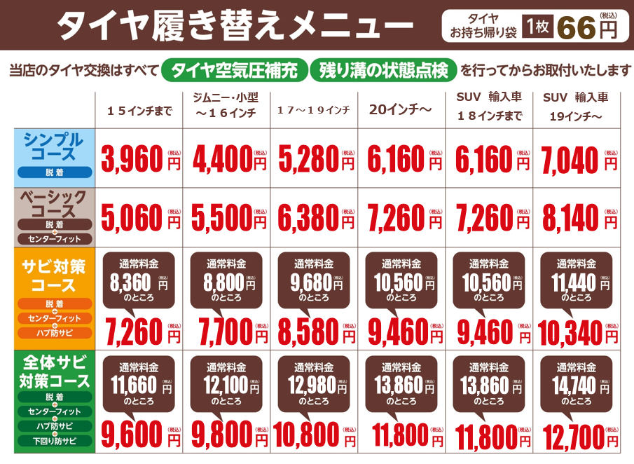 タイヤ履き替え金額改定のお知らせ