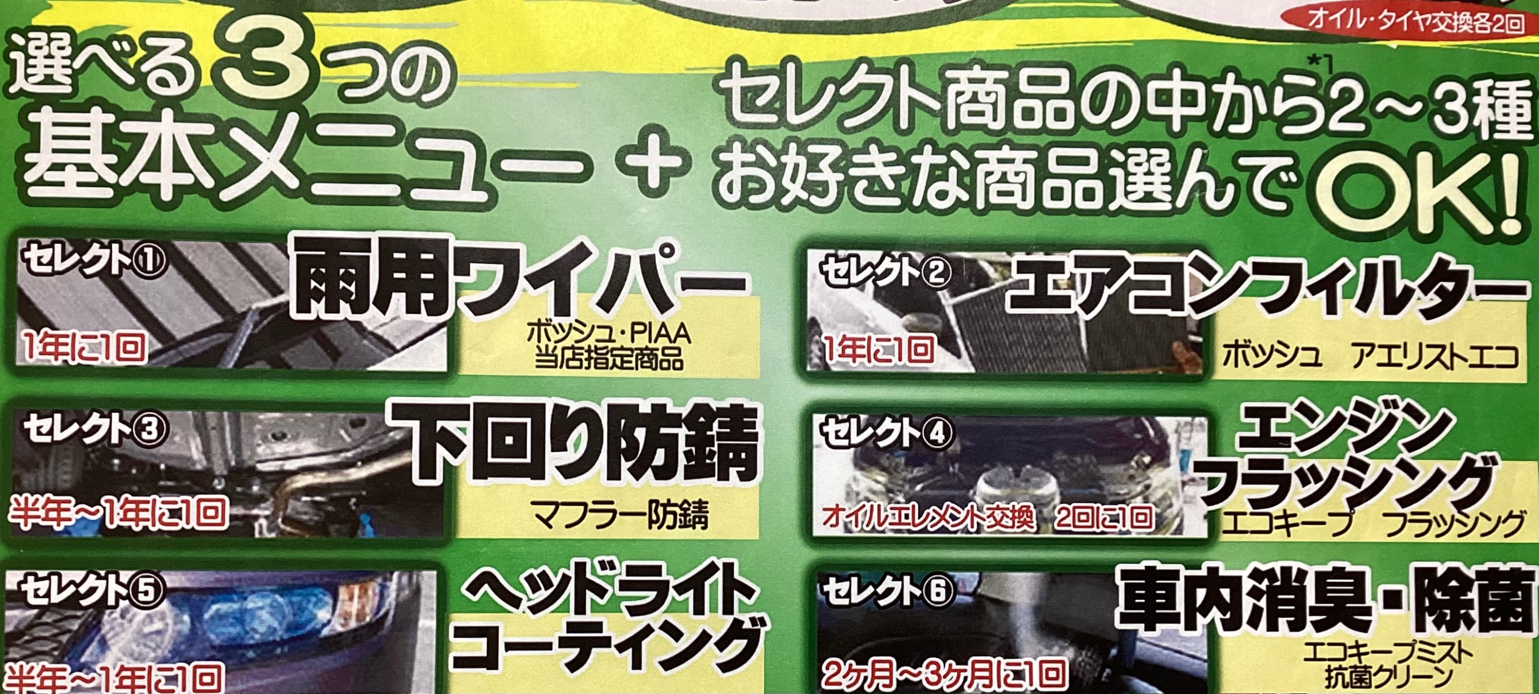 こちら含まれている作業内容がオイル交換2回とオイルフィルターの交換1回、これにセレクトメニューが2つ〜3つ選べるものとなっておりまして