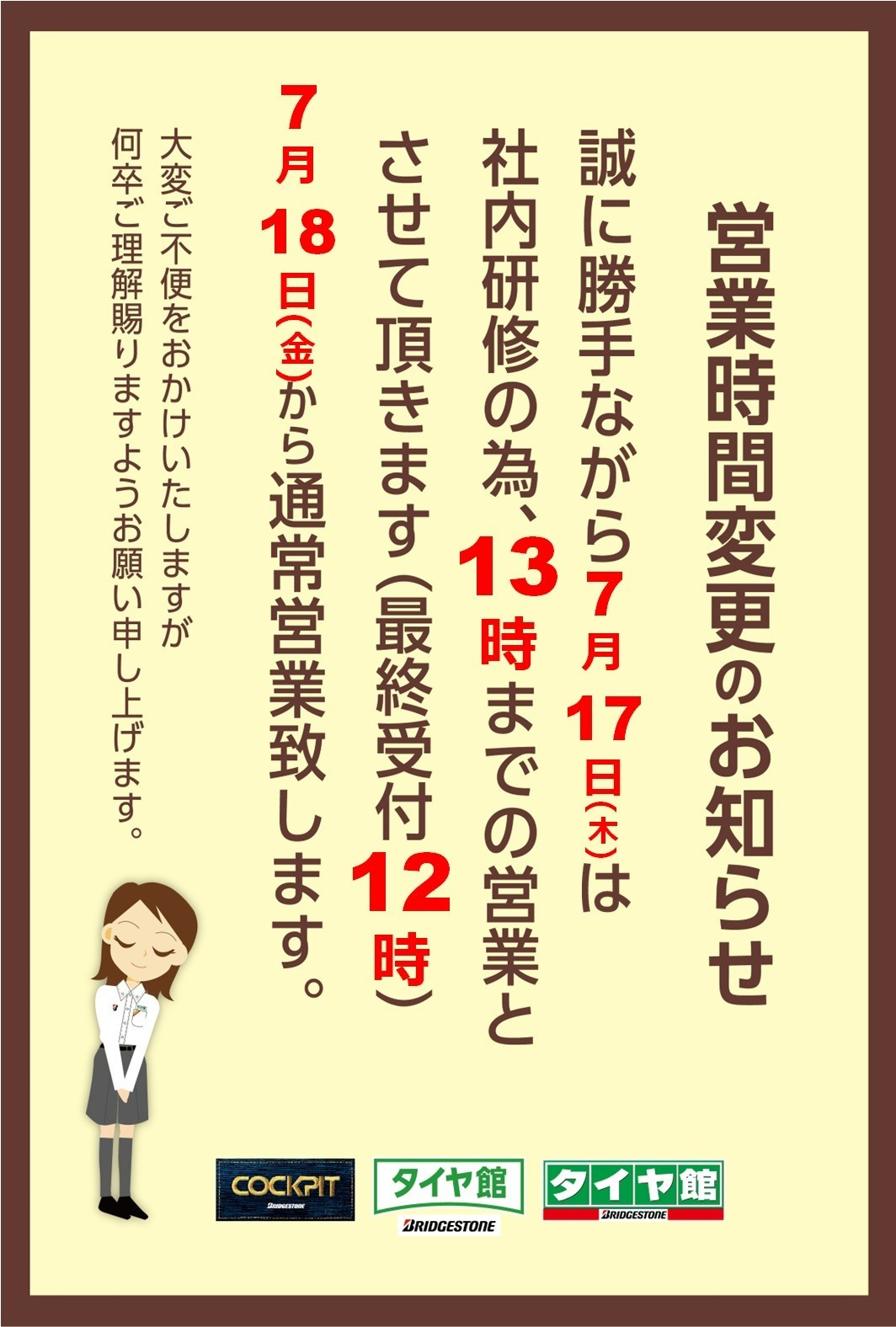 本日社内研修の為営業時間が短くなっています