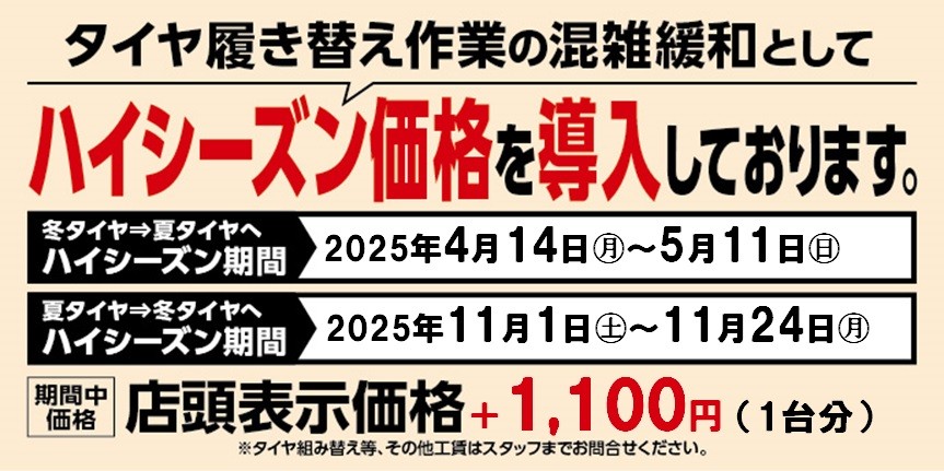 冬タイヤへの交換は11月よりハイシーズン価格とさせて頂きます。