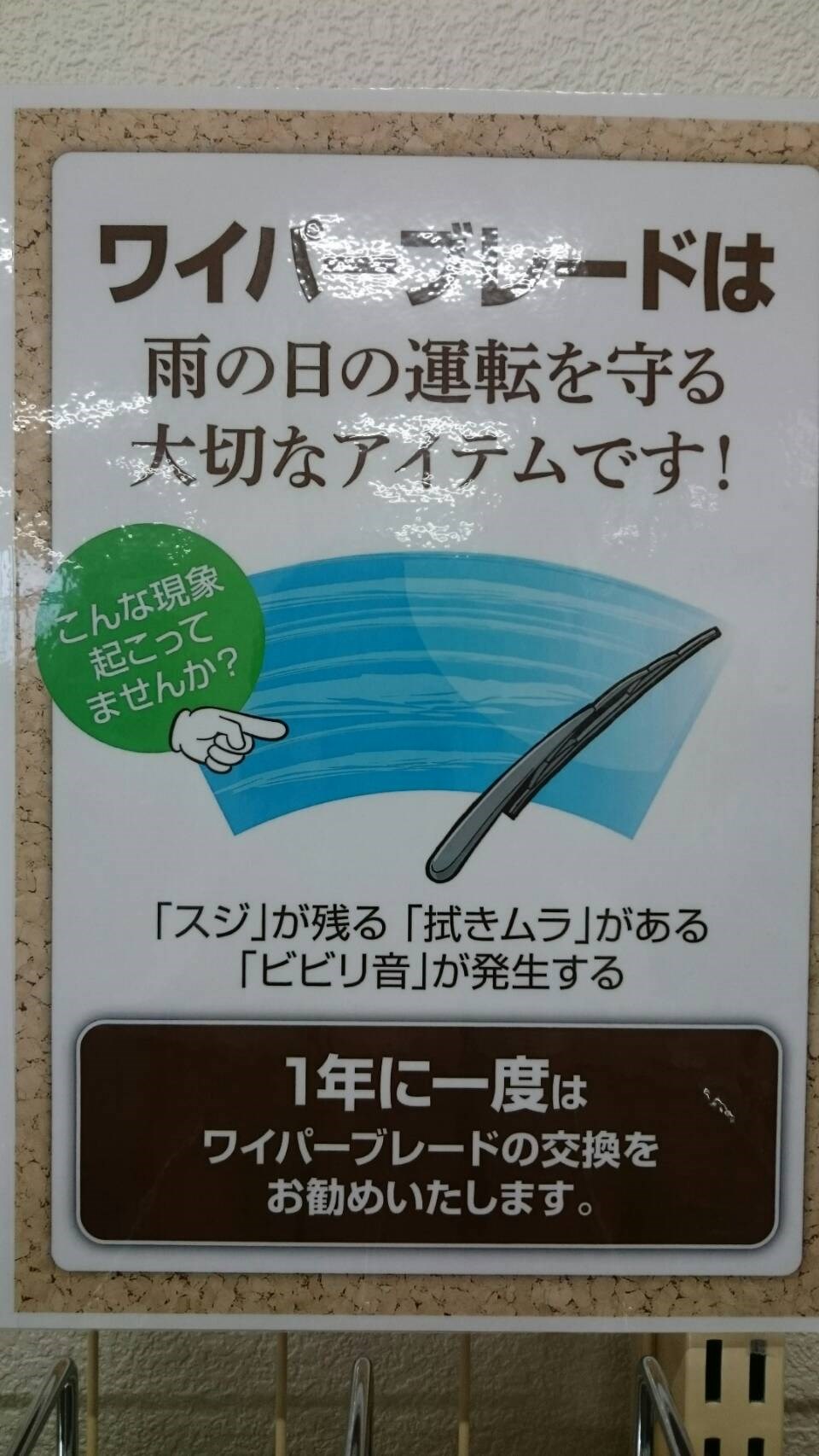 雨の日の必需品 ポスト 2017年5月12日 今週末は雨みたいですね。 ワイパ-チェックしてますか? いつの間にか拭き取り悪くなってたりするんですよね・・・。 「スジ」が残る 「拭きムラ」がある 「ビビリ音」が発生する ワイパ-の交換時期になっています。 1年に1度はワイパ-ブレ-ドの交換をお勧め致します。