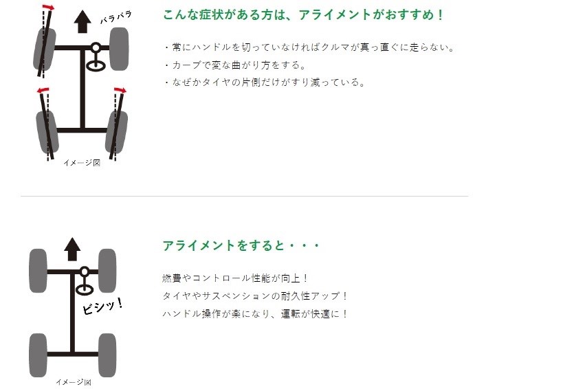 アライメント調整でしっかり路面に接地、性能発揮させてタイヤ長持ち!!
