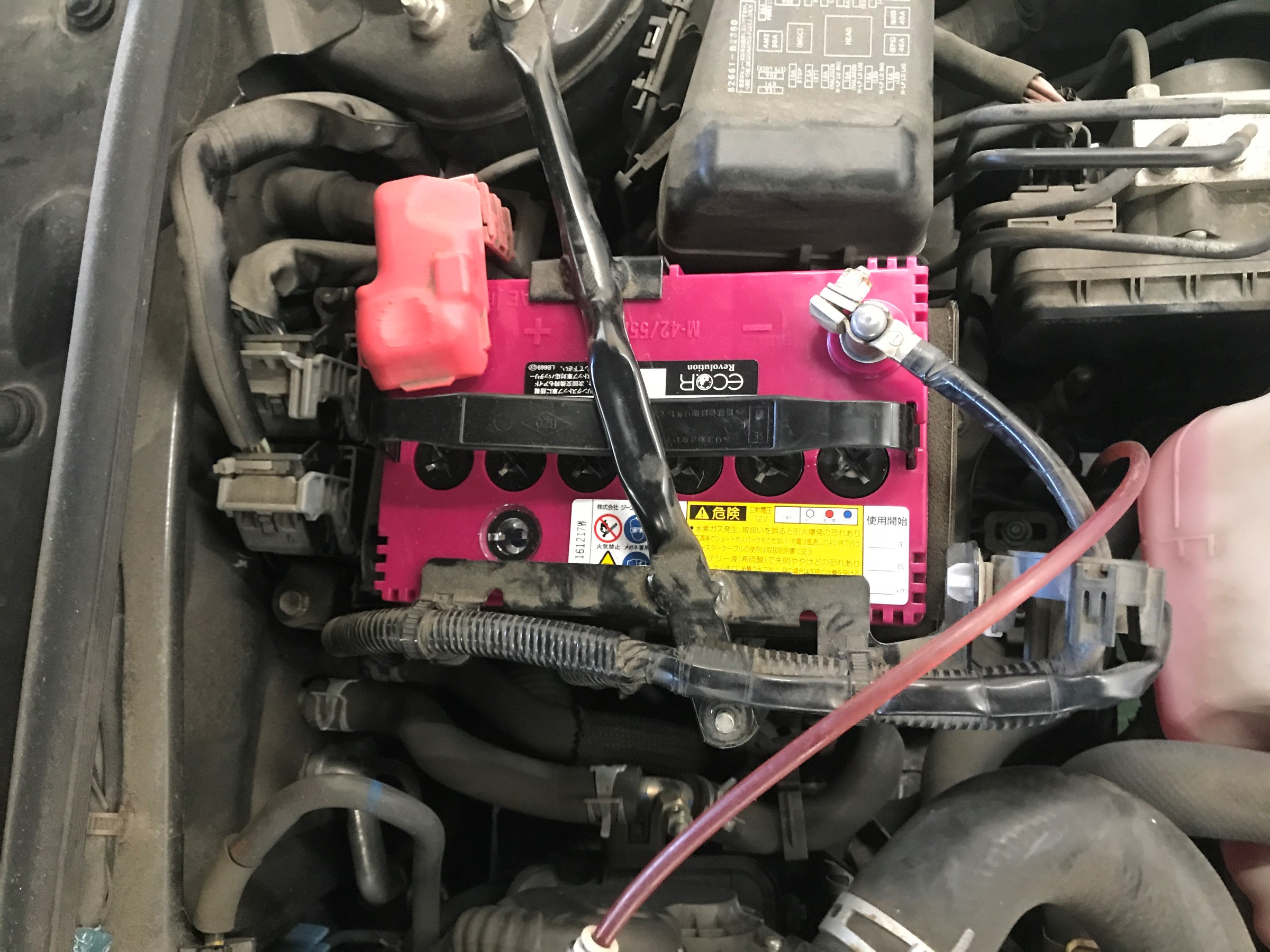 続いてバッテリーですが。こちらのコペンはアイドリングストップ付き車。