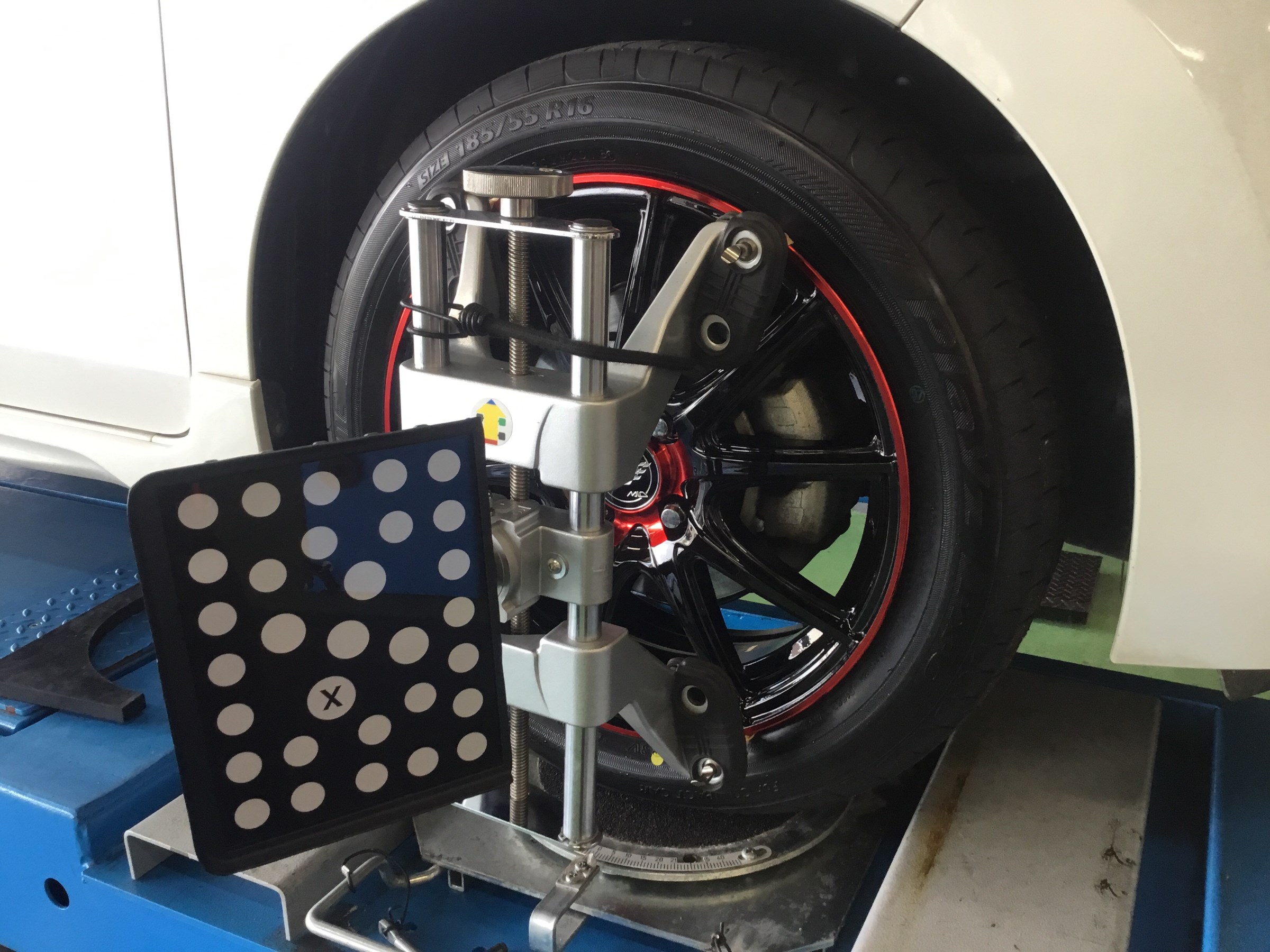 赤がアクセントのオシャレなホイールですね、もちろんアライメント調整もバッチリです。