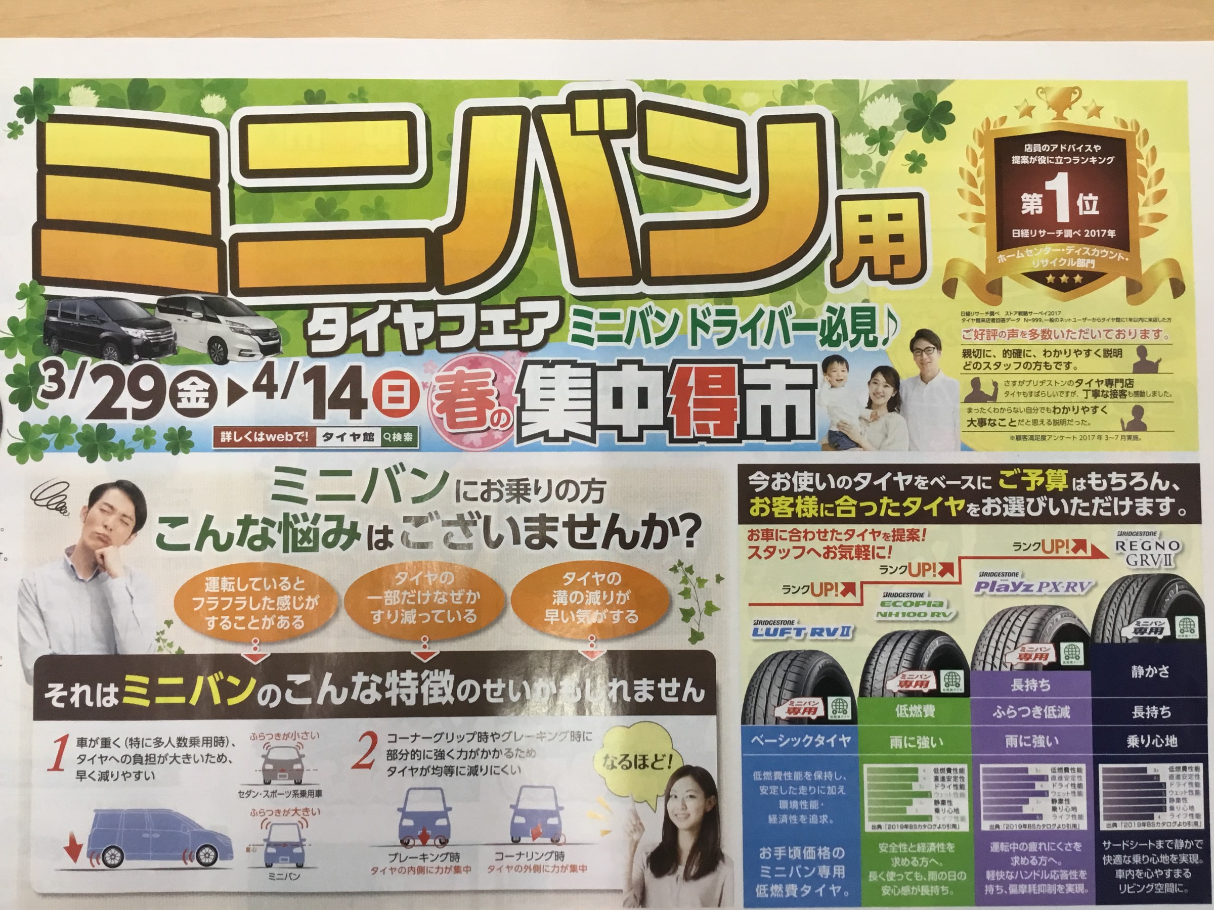明日、3月29日(金)からミニバン用タイヤフェアを開催します!!!