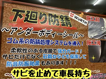 こんにちは! 道路も日陰が凍ってヒヤヒヤしますね! 最近見かける様になった塩カル散布 あのお陰で、凍った路面を溶かして 安全安心に走行出来ますが。 車にとっては、サビ拡大の要因です! そこで下回りのサビ止め! サビが進行すると車検が取れなくなってしまったり 膨大な修理費用が発生してし...