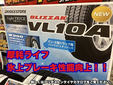 こんにちは! 朝・晩冷え込んで来ましたね! 本日は、軽トラックやライトバン等の働く車の スタッドレスタイヤのご紹介です。 9月新発売になりました。 ブリザックVL10A!! VL1からの性能変化は、 冬タイヤとしての摩耗ライフ 14%向上! 氷上ブレーキ性能 13%向上! 「効き」と「長持ち」が向...